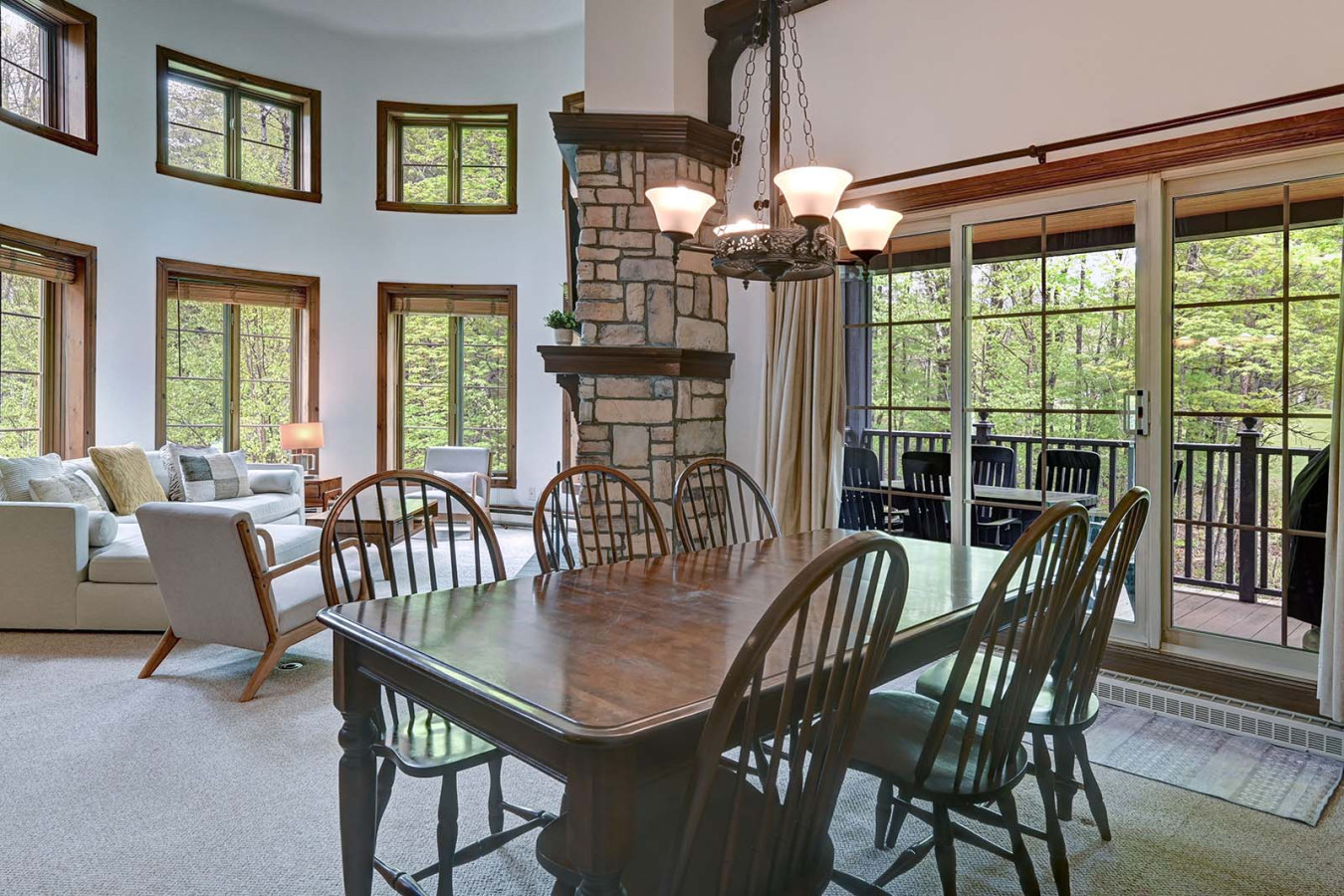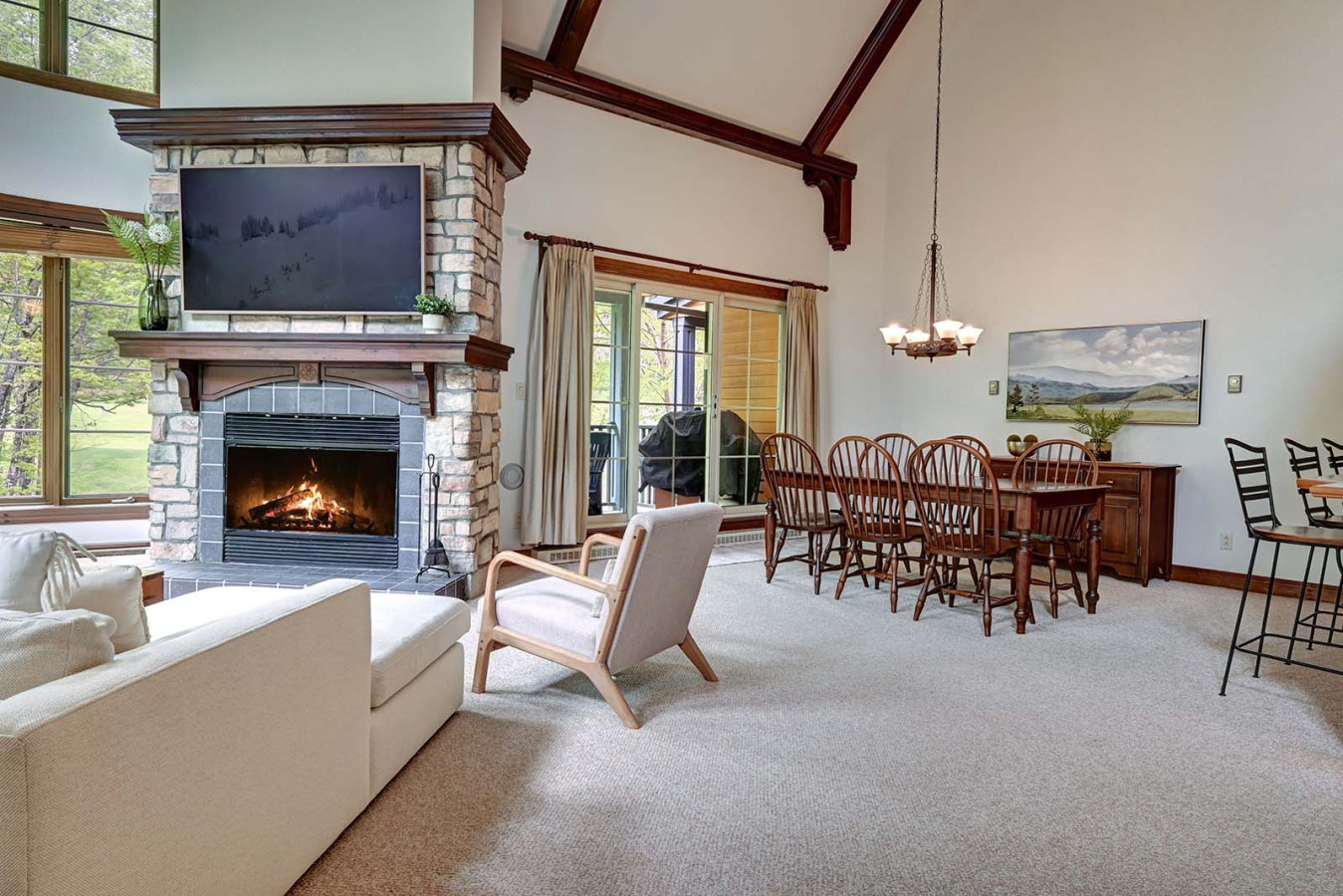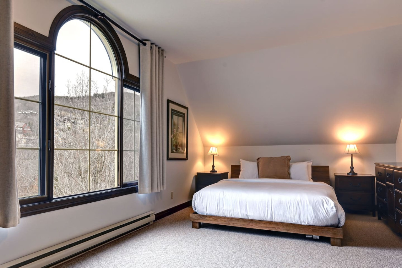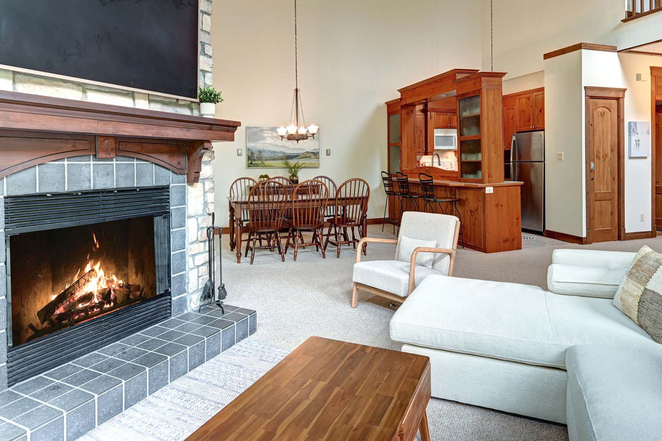 As you walk through the door, you'll be greeted by the impressive high ceilings and circular living room complete with a wood burning fireplace and Smart TV. The large windows provide bright natural light and the adjacent private balcony overlooks Tremblant’s Le Geant golf course.