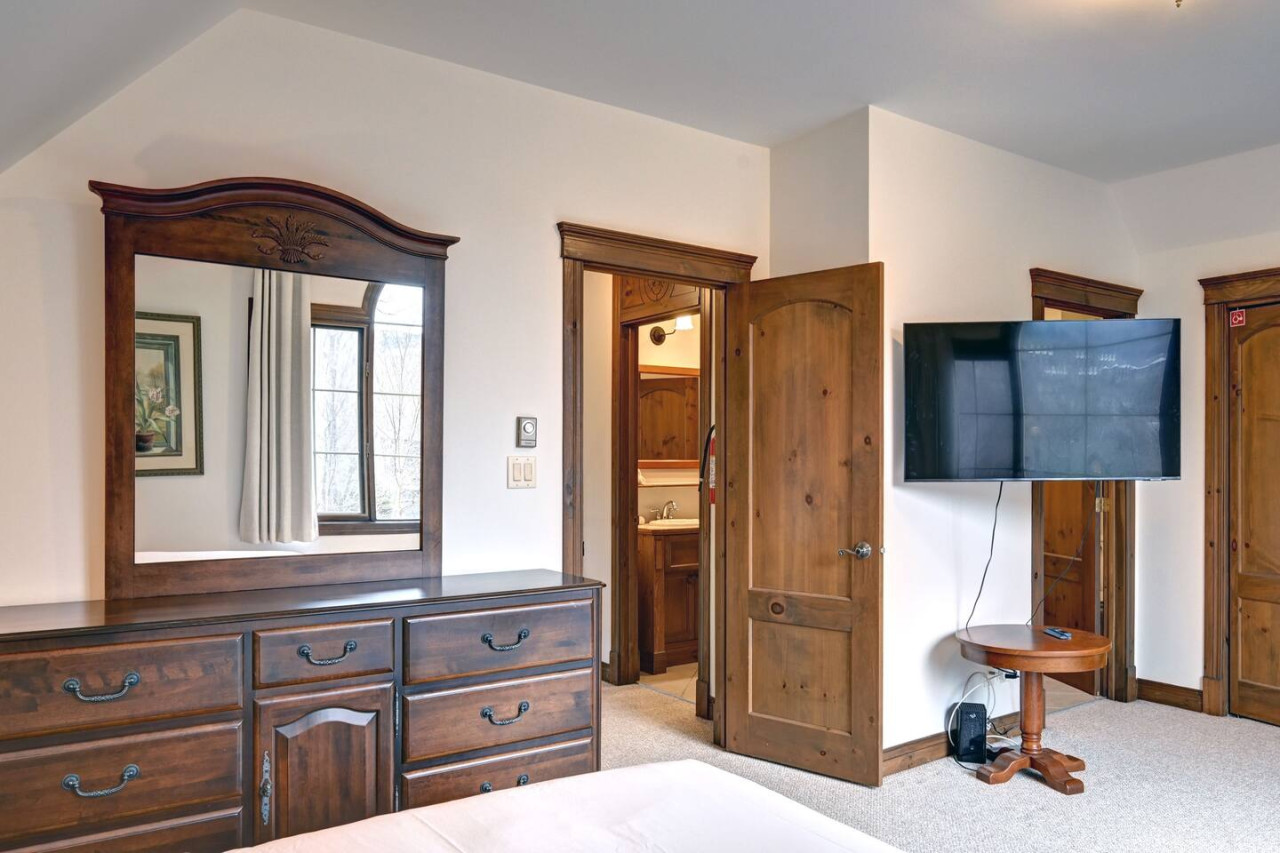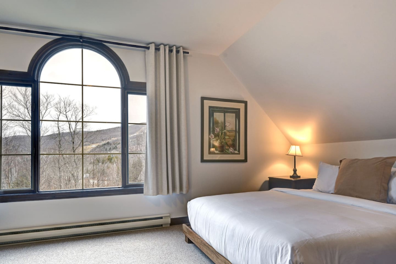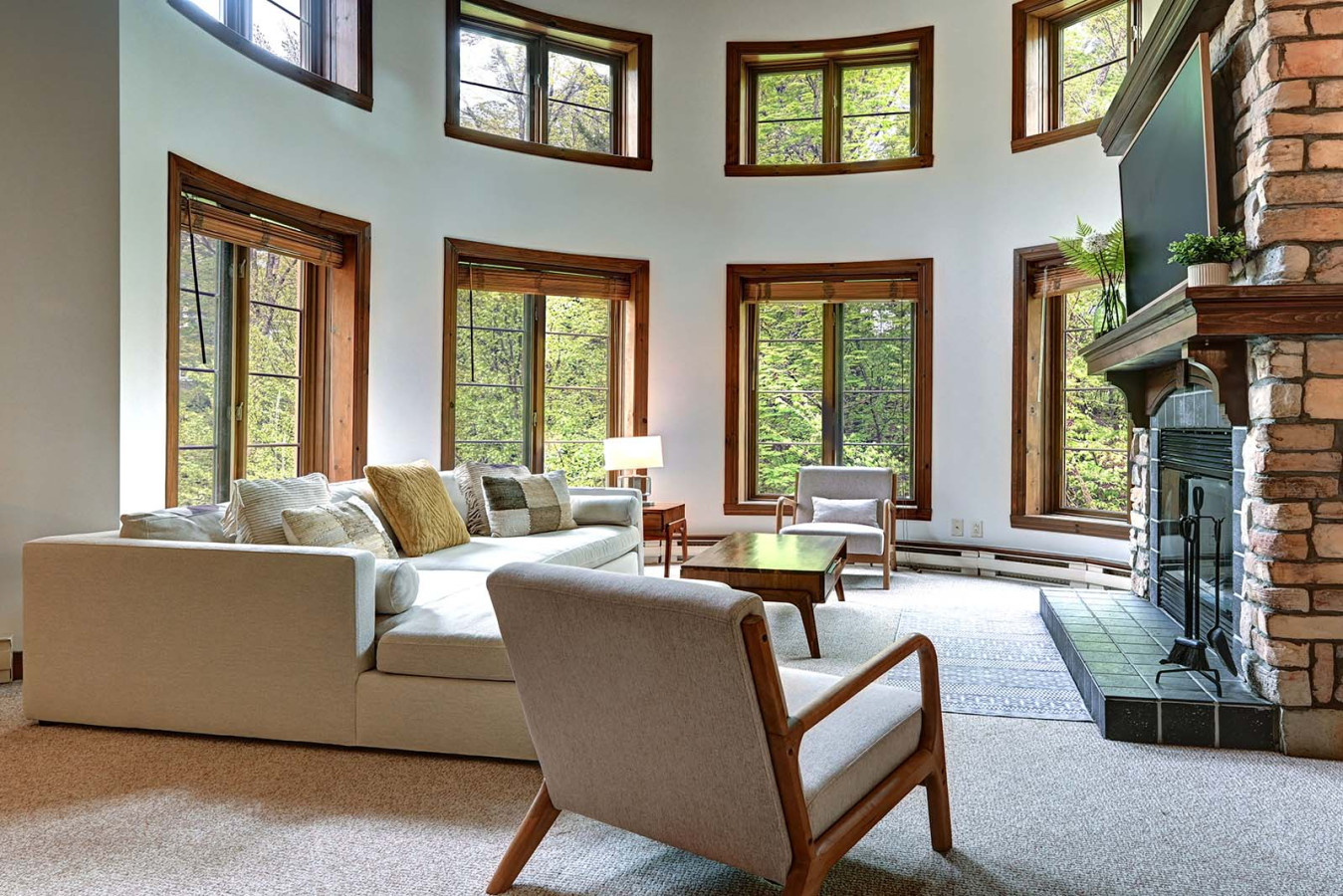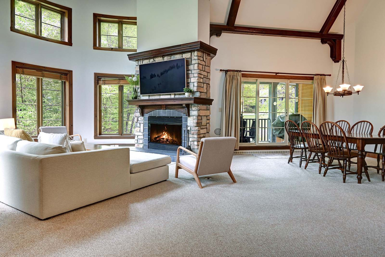 As you walk through the door, you'll be greeted by the impressive high ceilings and circular living room complete with a wood burning fireplace and Smart TV. The large windows provide bright natural light and the adjacent private balcony overlooks Tremblant’s Le Geant golf course.