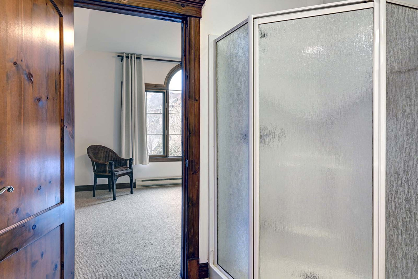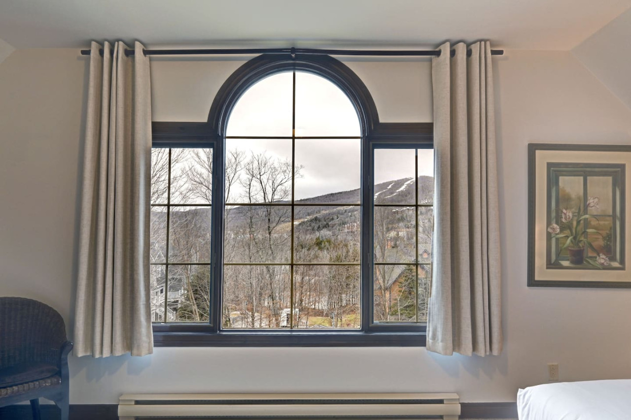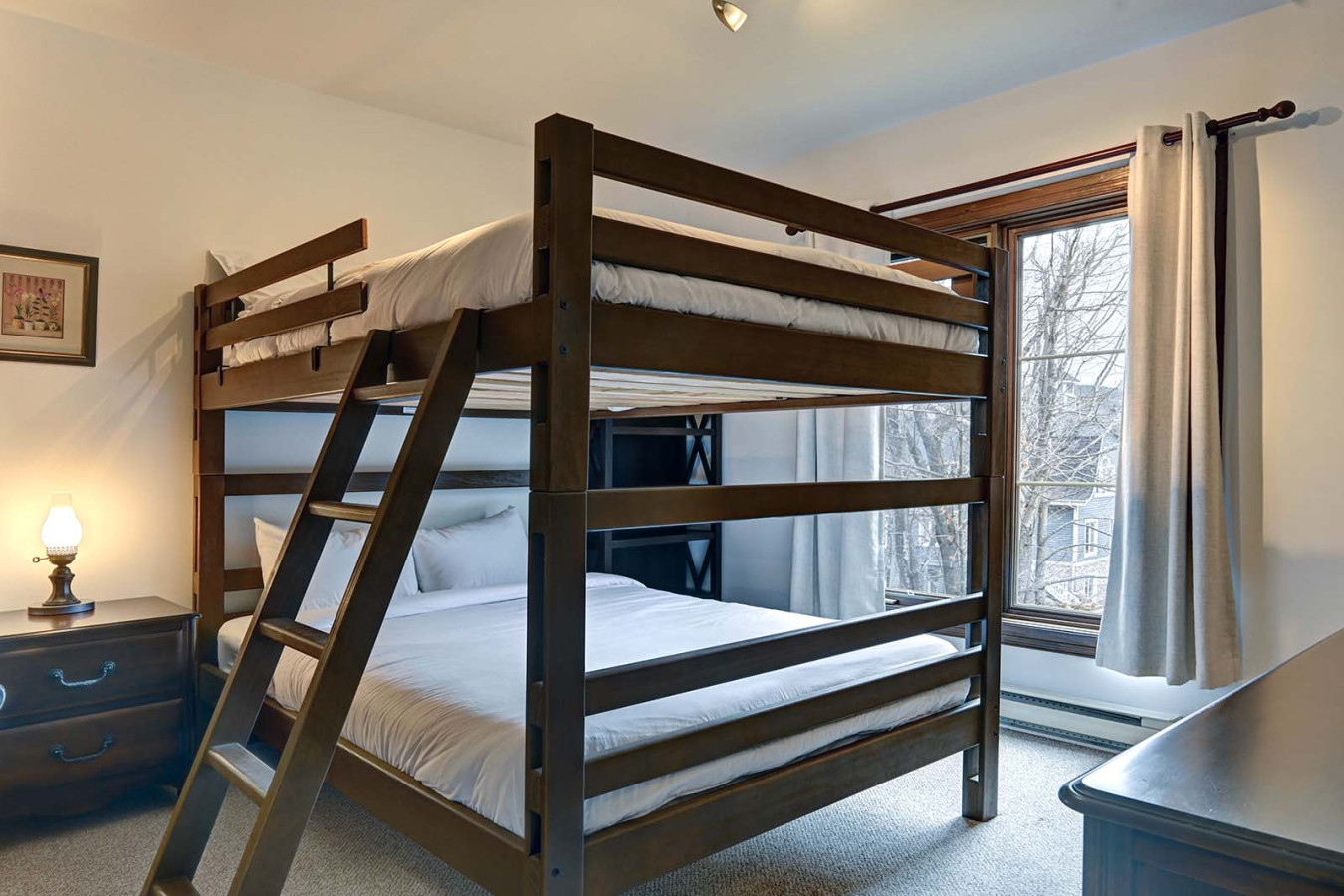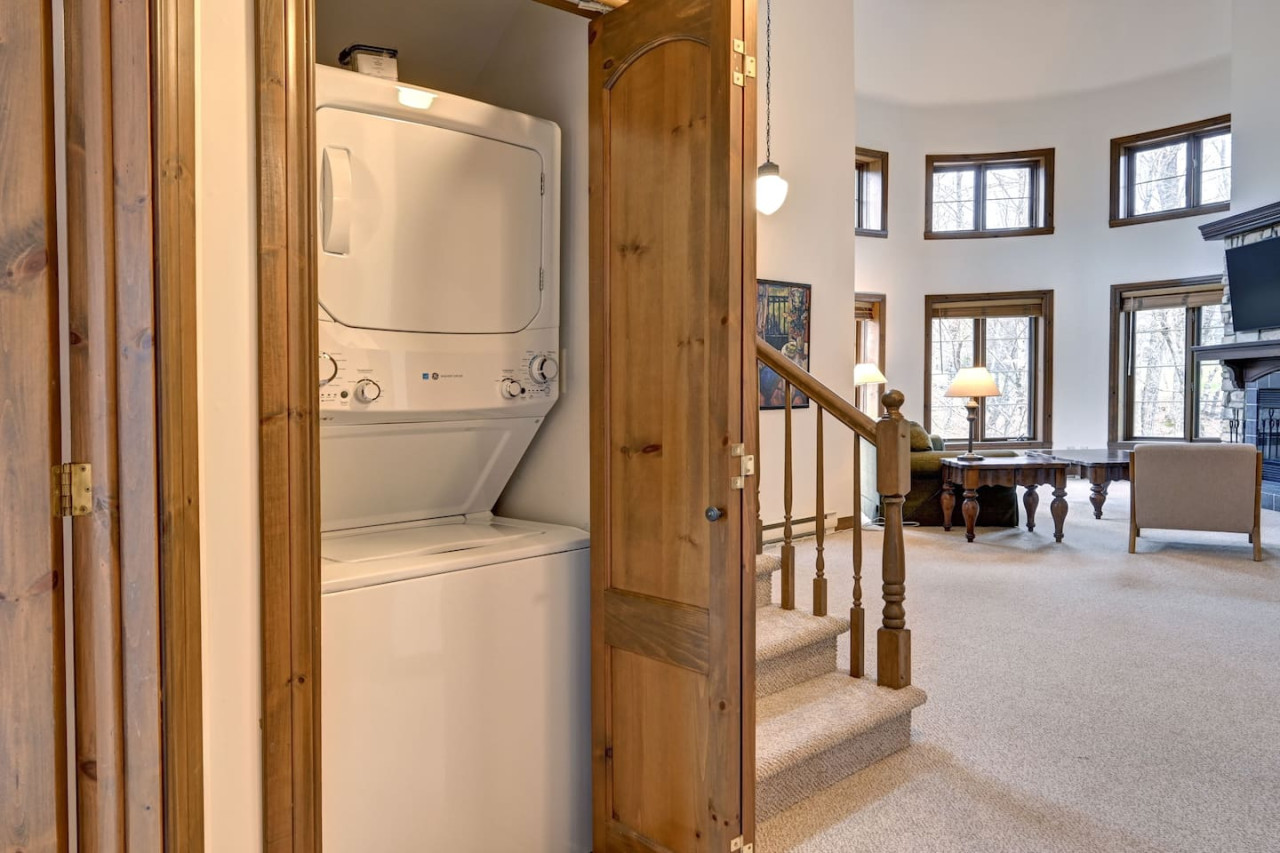 As you walk through the door, you'll be greeted by the impressive high ceilings and circular living room complete with a wood burning fireplace and Smart TV. The large windows provide bright natural light and the adjacent private balcony overlooks Tremblant’s Le Geant golf course.