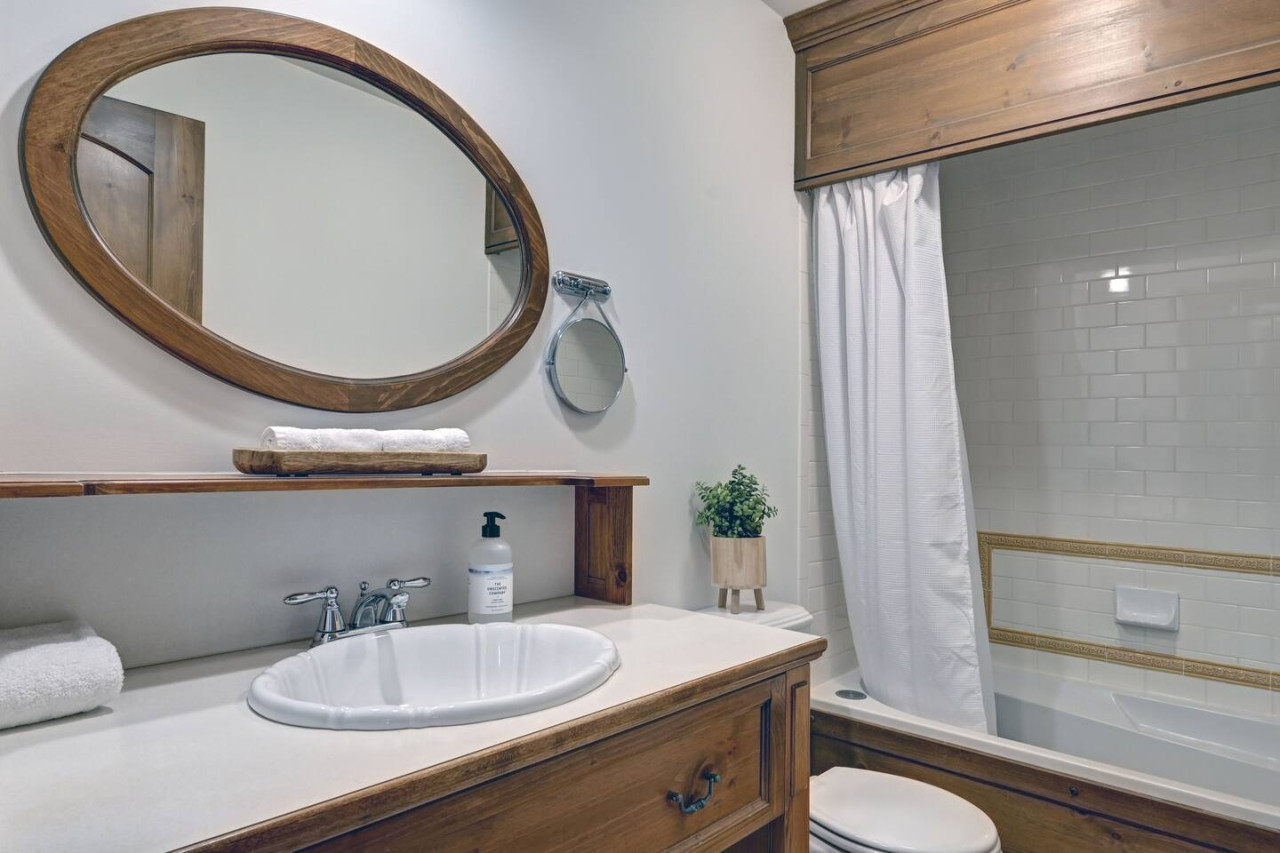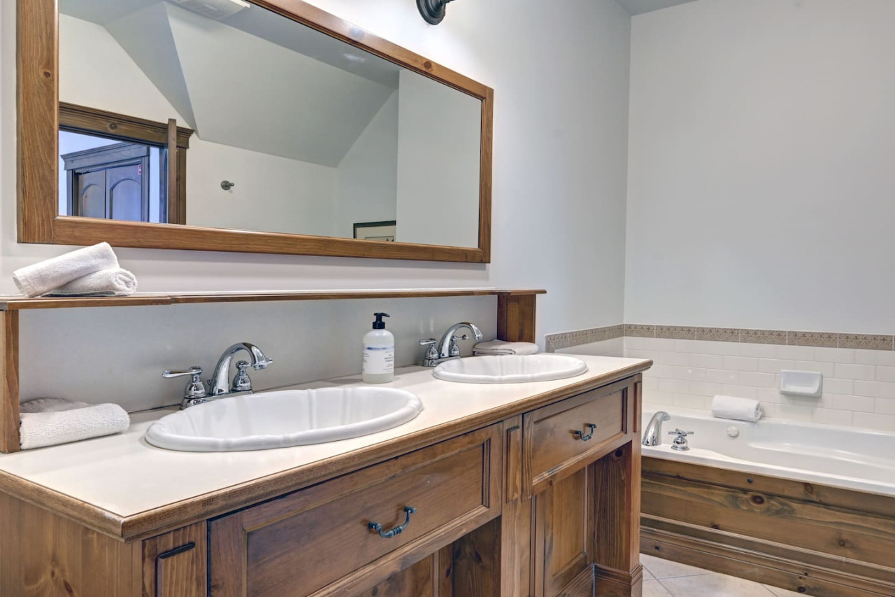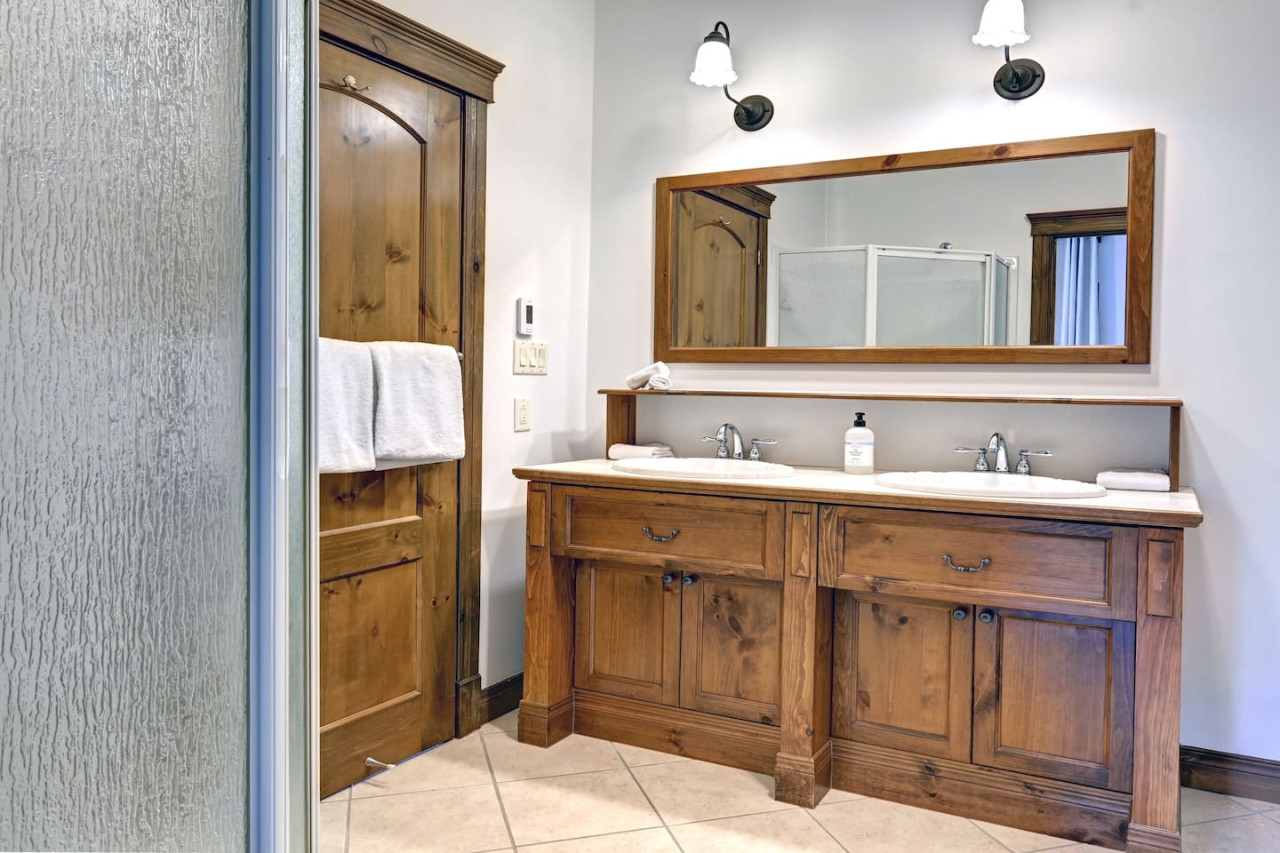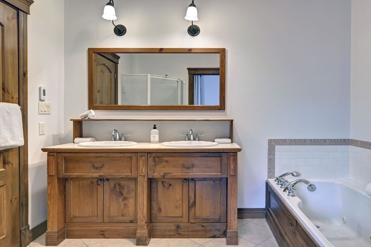 Cette maison dispose de deux salles de bains complètes. Au rez-de-chaussée, il y a une douche dans la baignoire et à l'étage, il y a une douche séparée et une baignoire sur pied dans la suite de la chambre principale.