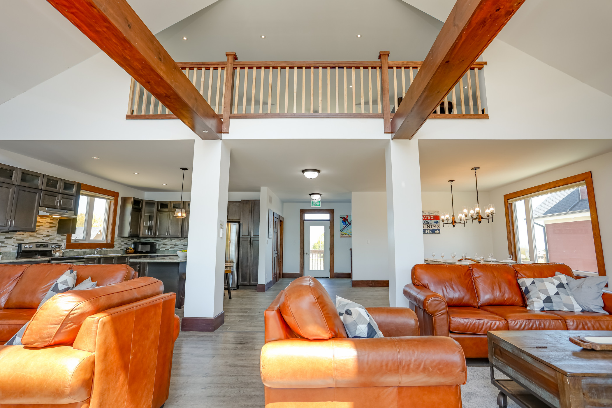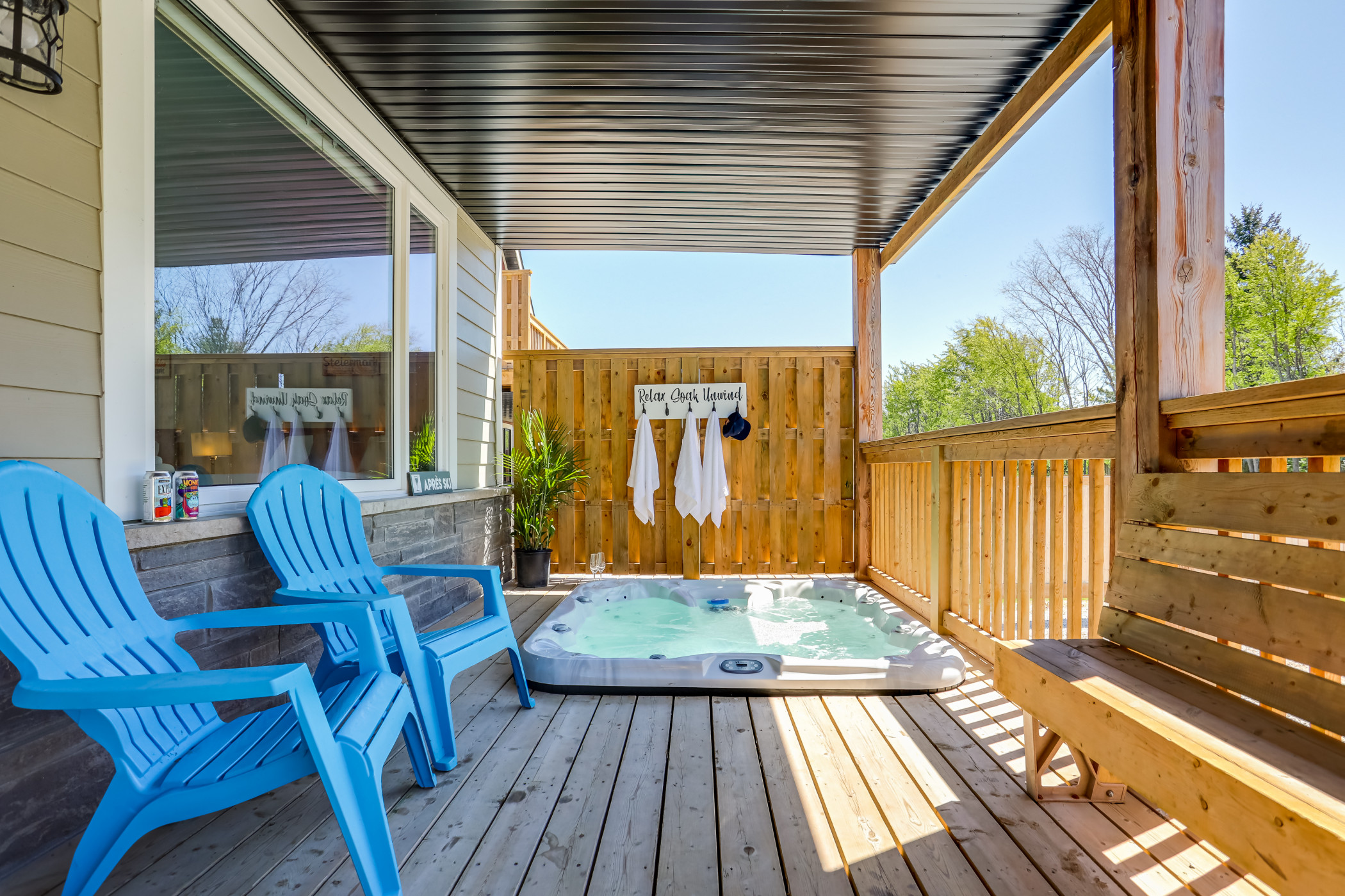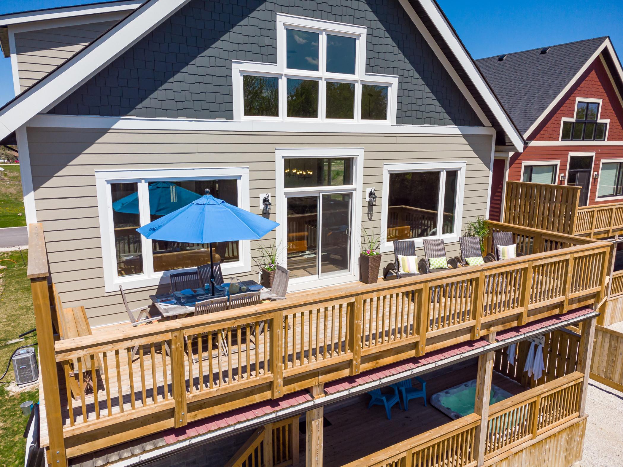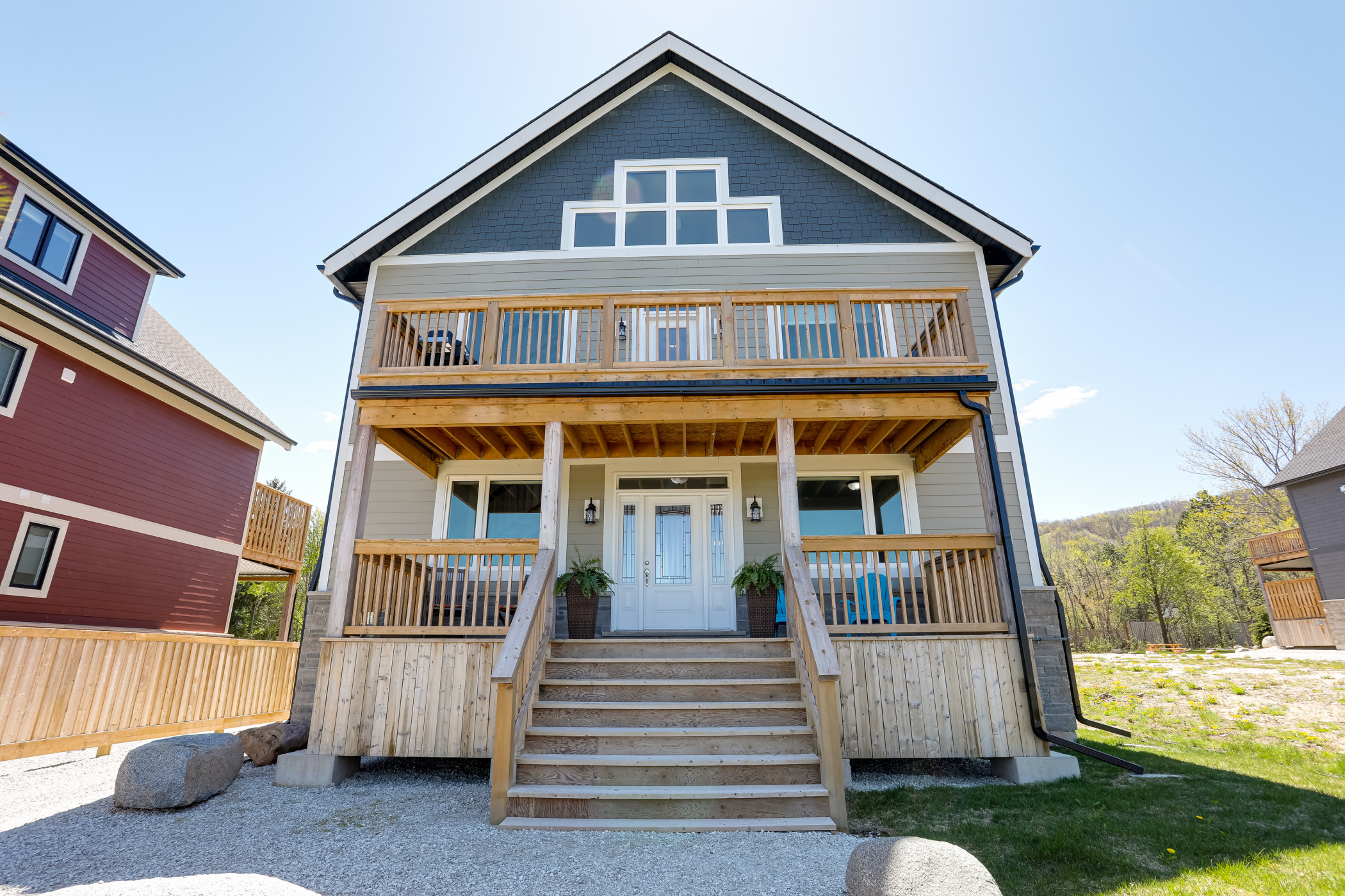 Modern, clean, fresh and bright! Great views are accompanied by the ideal combination of privacy and quiet. Walk outside onto either of the two balconies to see the ski hill’s lights at night or enjoy the view inside the built-in hot tub. This chalet is only a short 12 min walk or 3 min drive to The Blue Mountain Village and ski slopes. Take advantage of this spacious chalet including an upstairs loft perfect for a yoga class or simply a hangout spot with comfortable couches, a TV, and a ping pong table! This property has ample indoor and outdoor space to provide your group catering services. Enjoy this fully loaded chalet with all modern conveniences inside an atmosphere that you won’t want to leave.