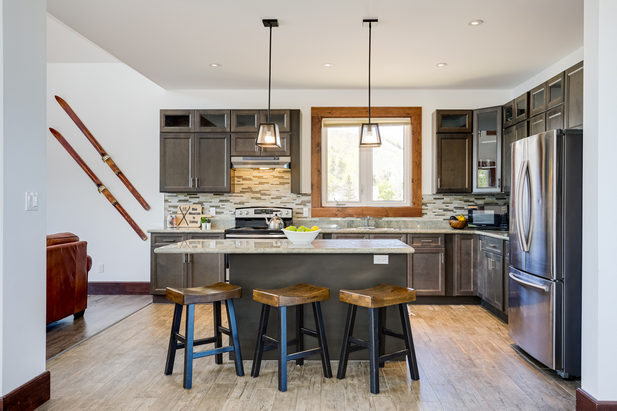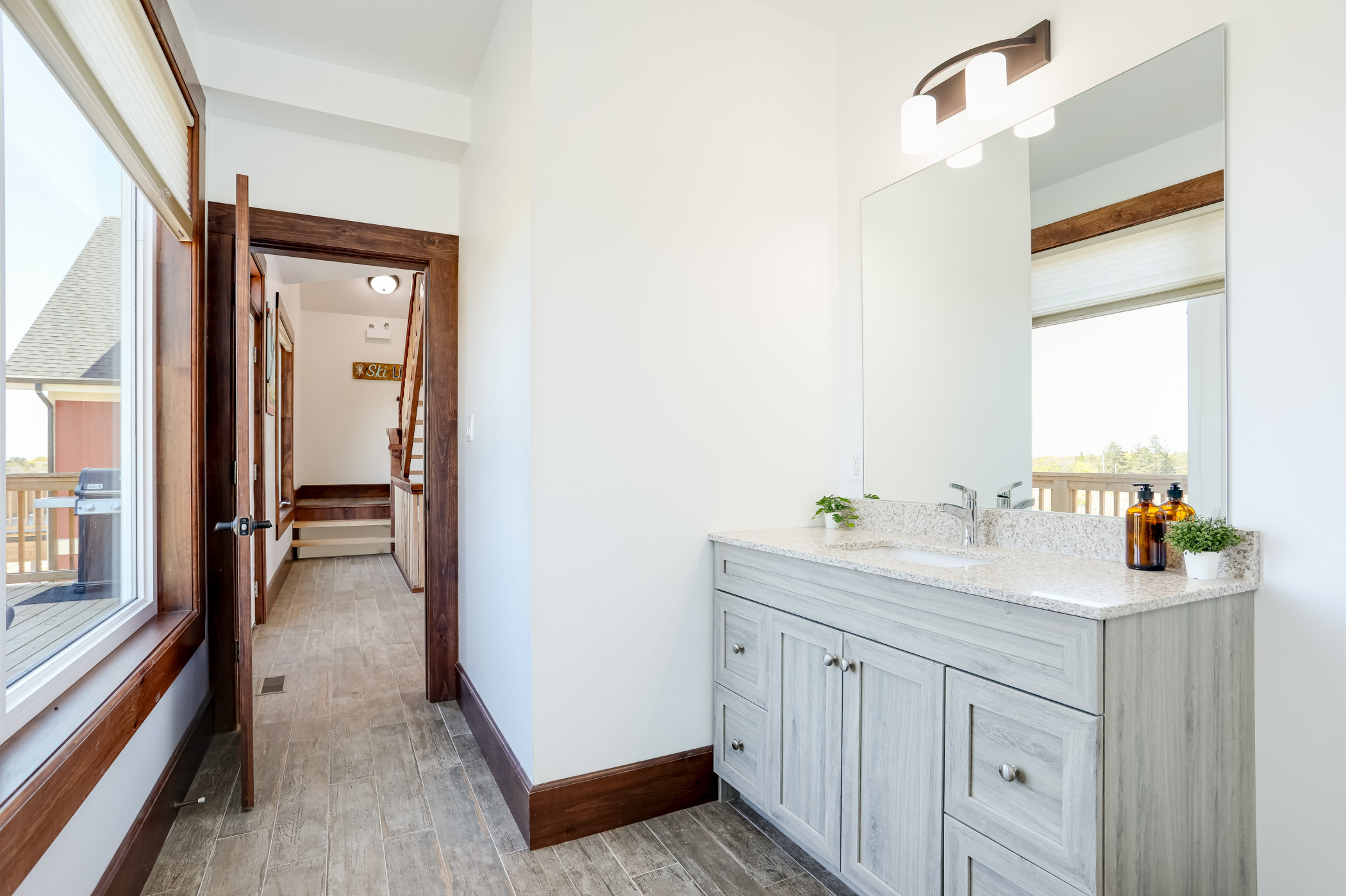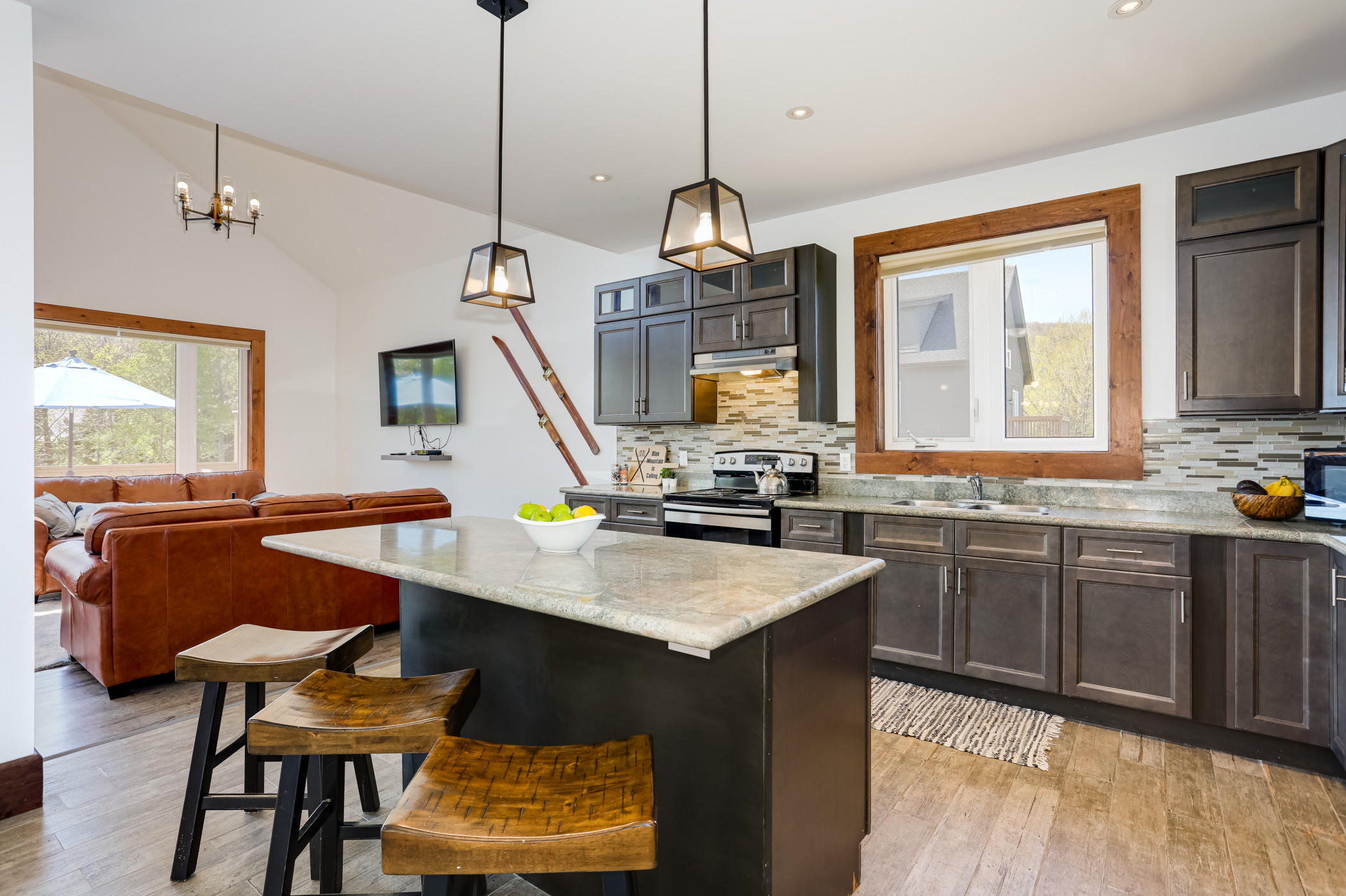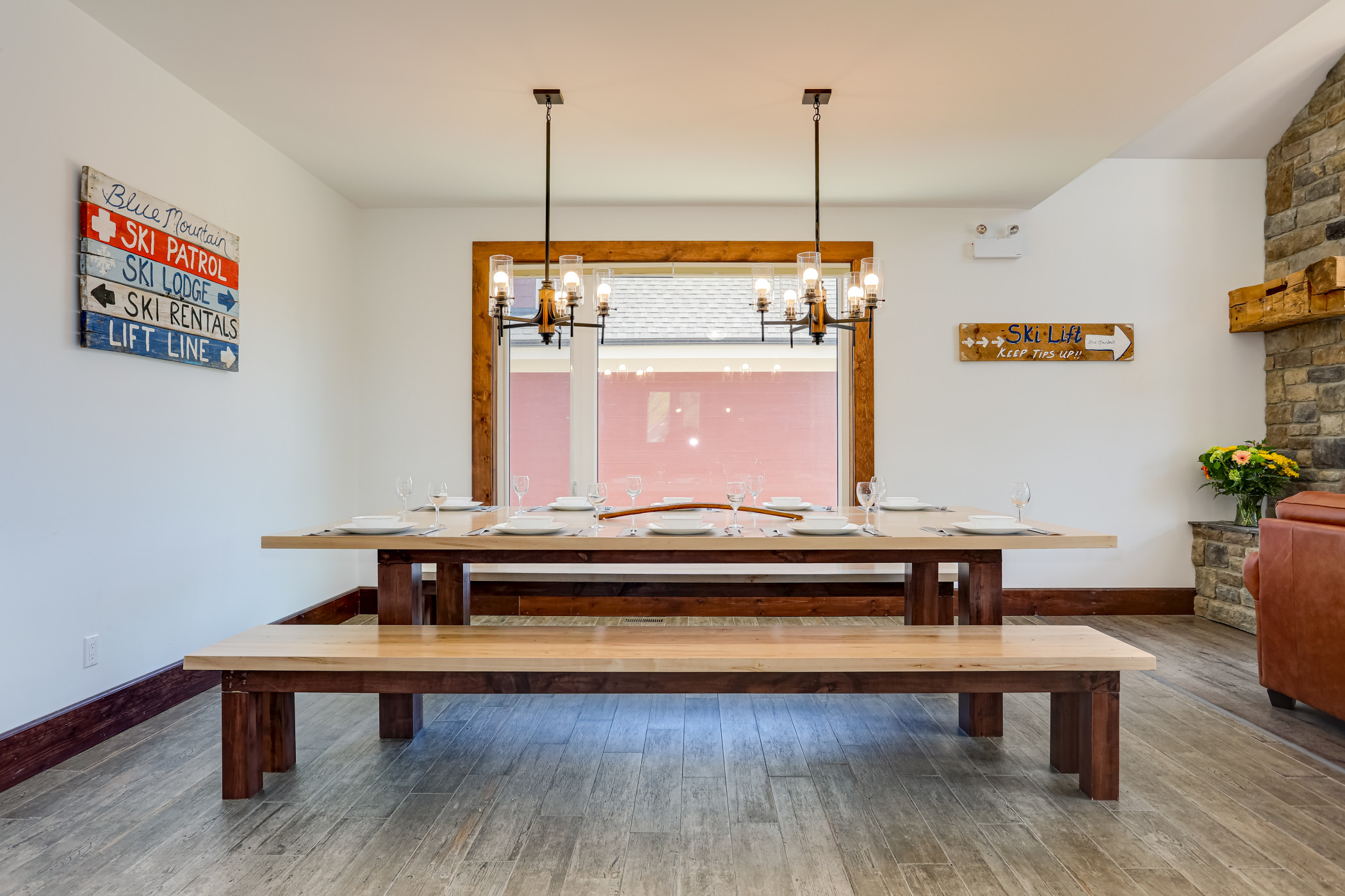 The kitchen offers an abundance of space for cooking and serving meals around the large dining table. It is fully equipped with modern appliances and everything you need including a dishwasher, stove, fridge, microwave, electric coffee & tea maker, toaster, cookware, bakeware and more! All you need to bring is your food and seasonings. Across from the kitchen is the spacious dining area with a long harvest table that provides comfortable seating for your large group while dining.