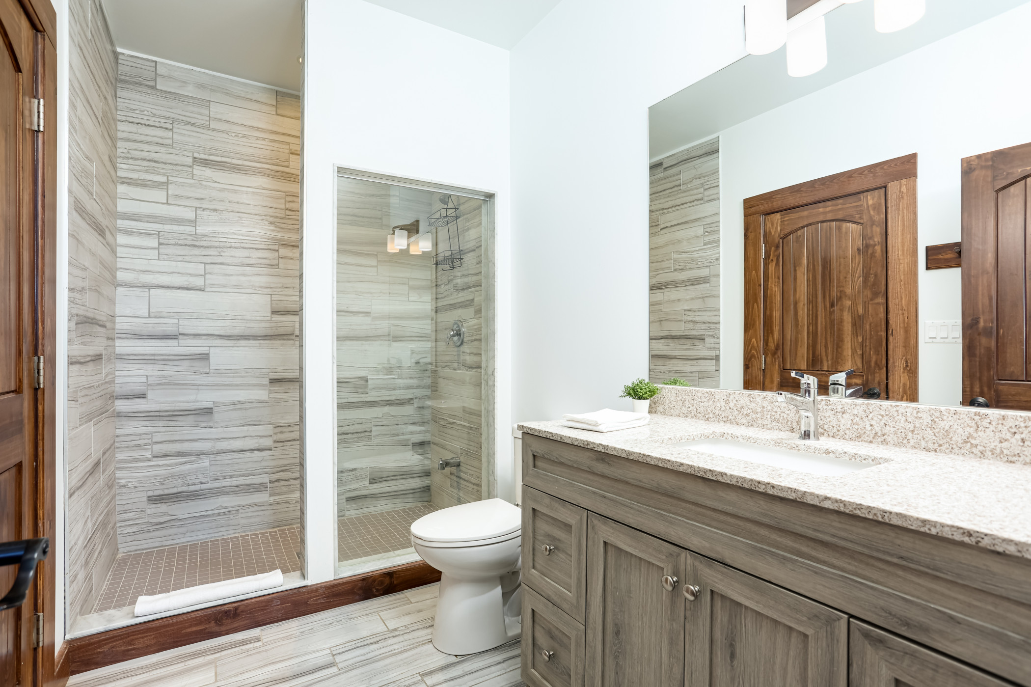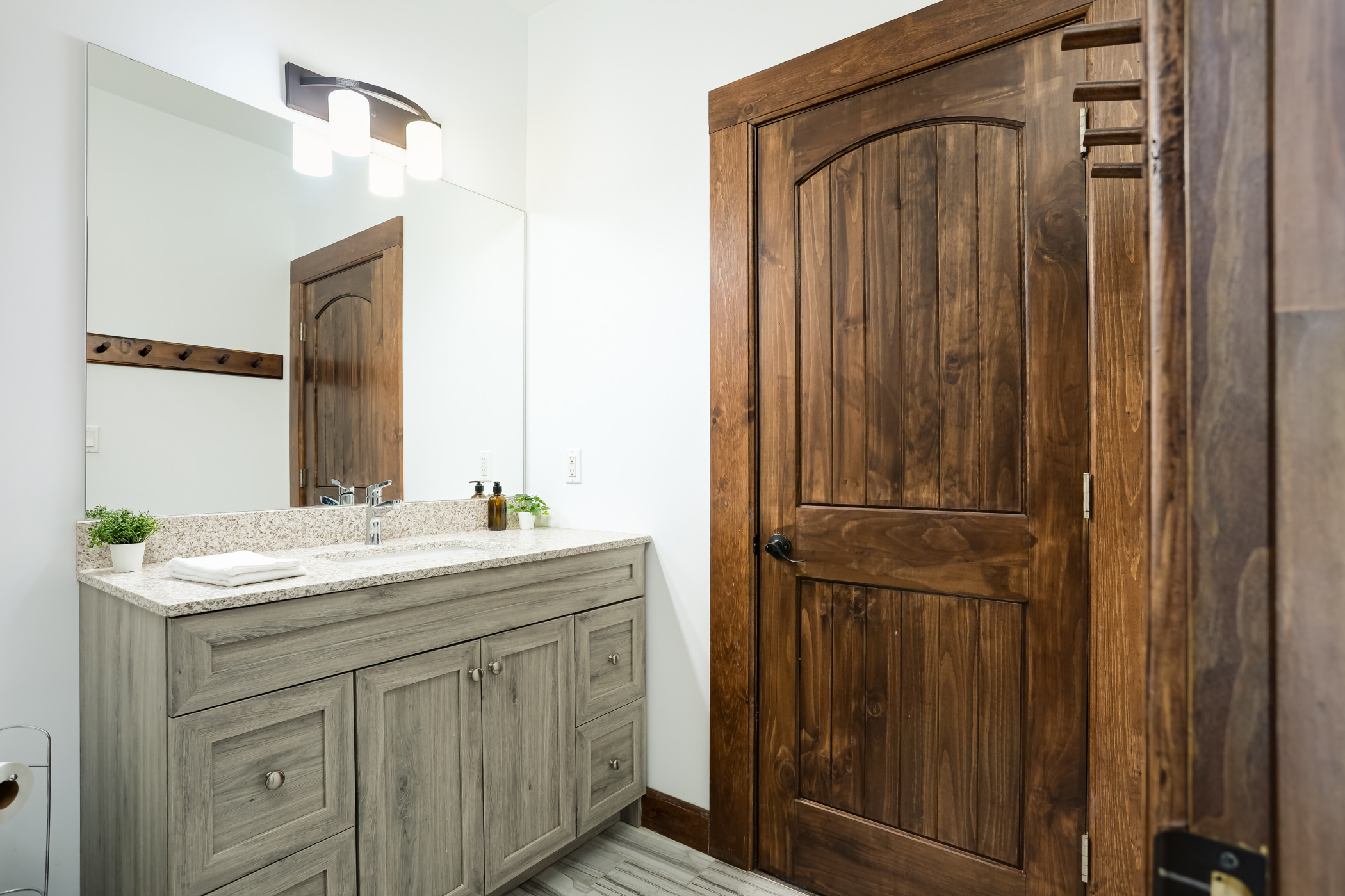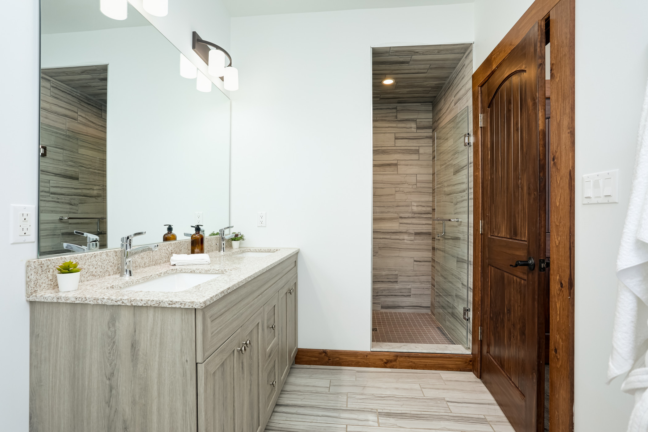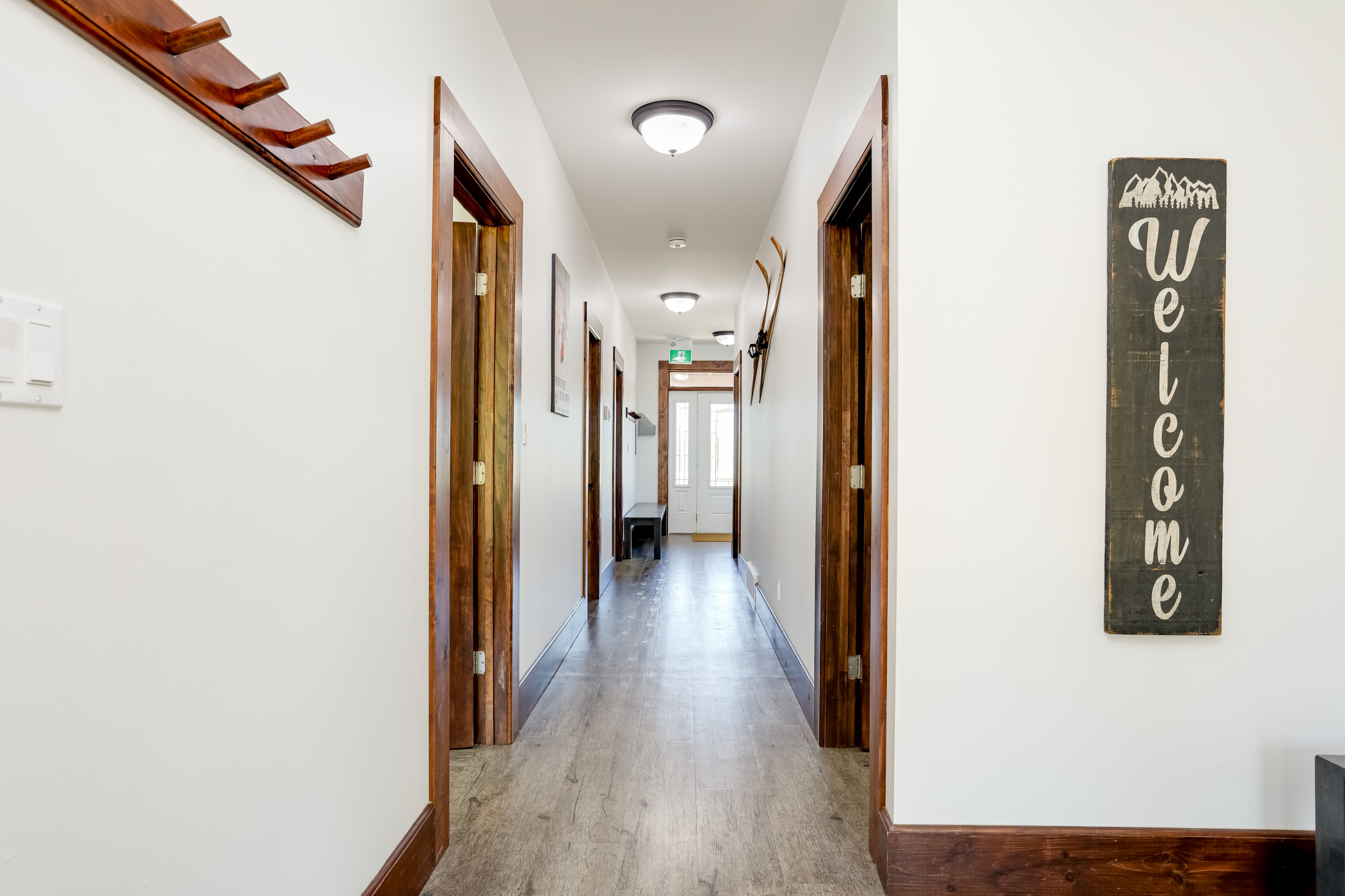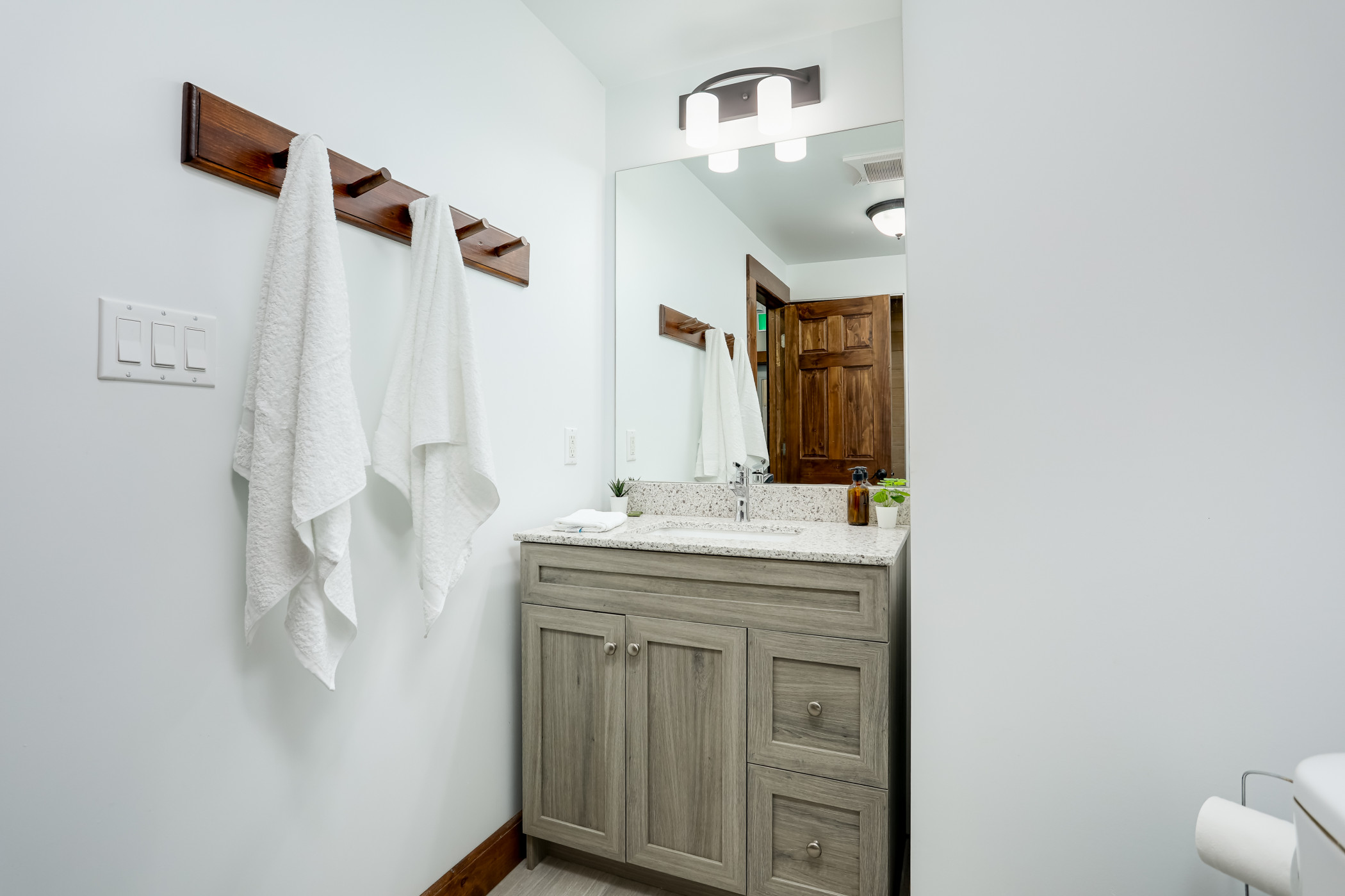 The kitchen offers an abundance of space for cooking and serving meals around the large dining table. It is fully equipped with modern appliances and everything you need including a dishwasher, stove, fridge, microwave, electric coffee & tea maker, toaster, cookware, bakeware and more! All you need to bring is your food and seasonings. Across from the kitchen is the spacious dining area with a long harvest table that provides comfortable seating for your large group while dining.