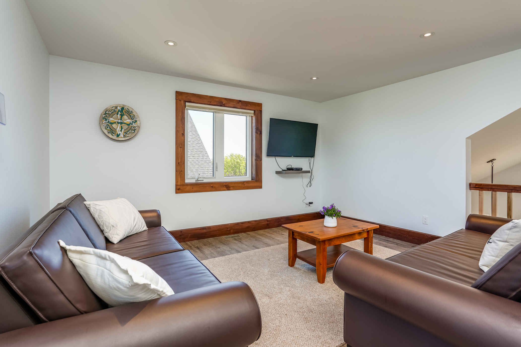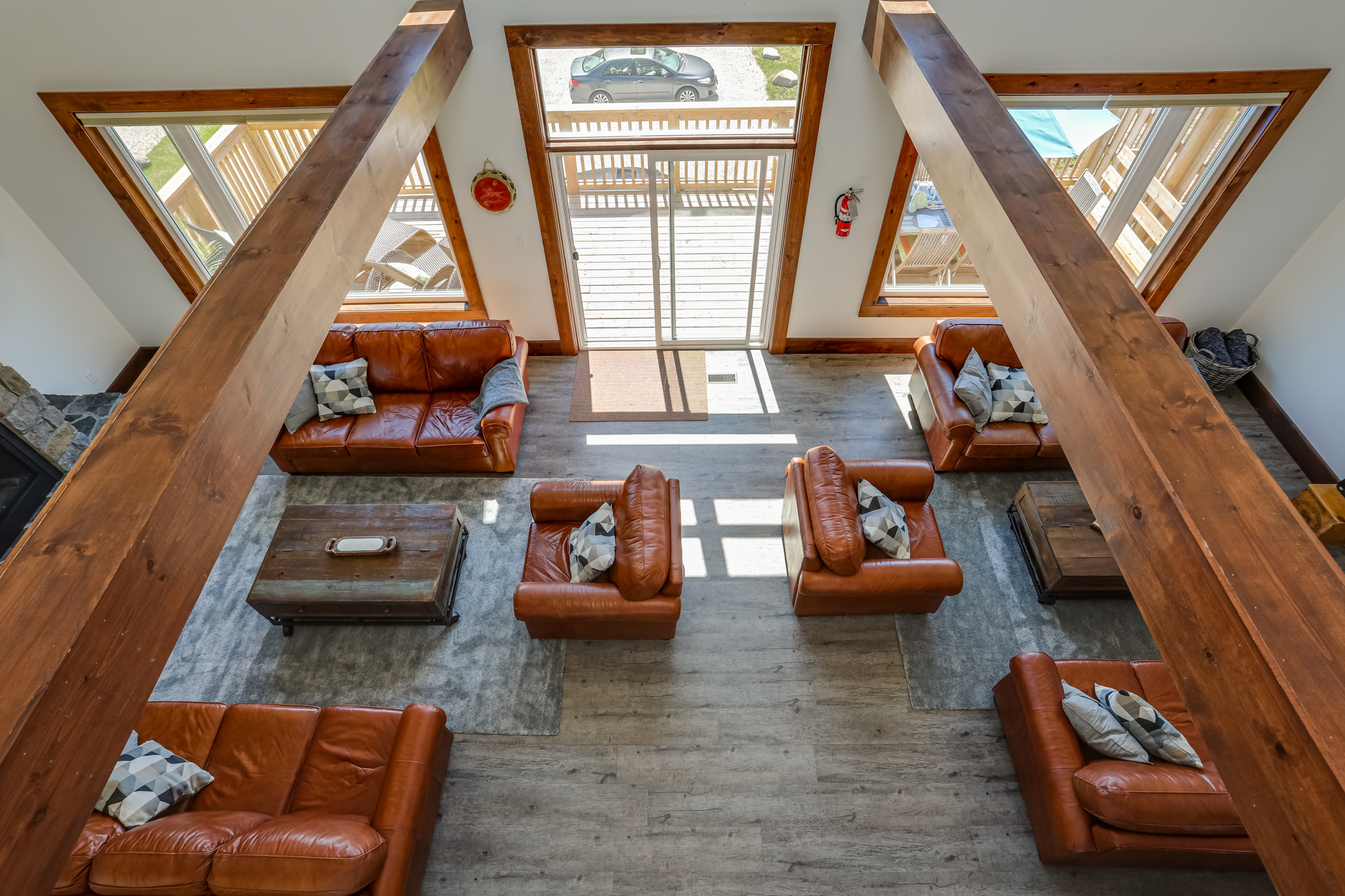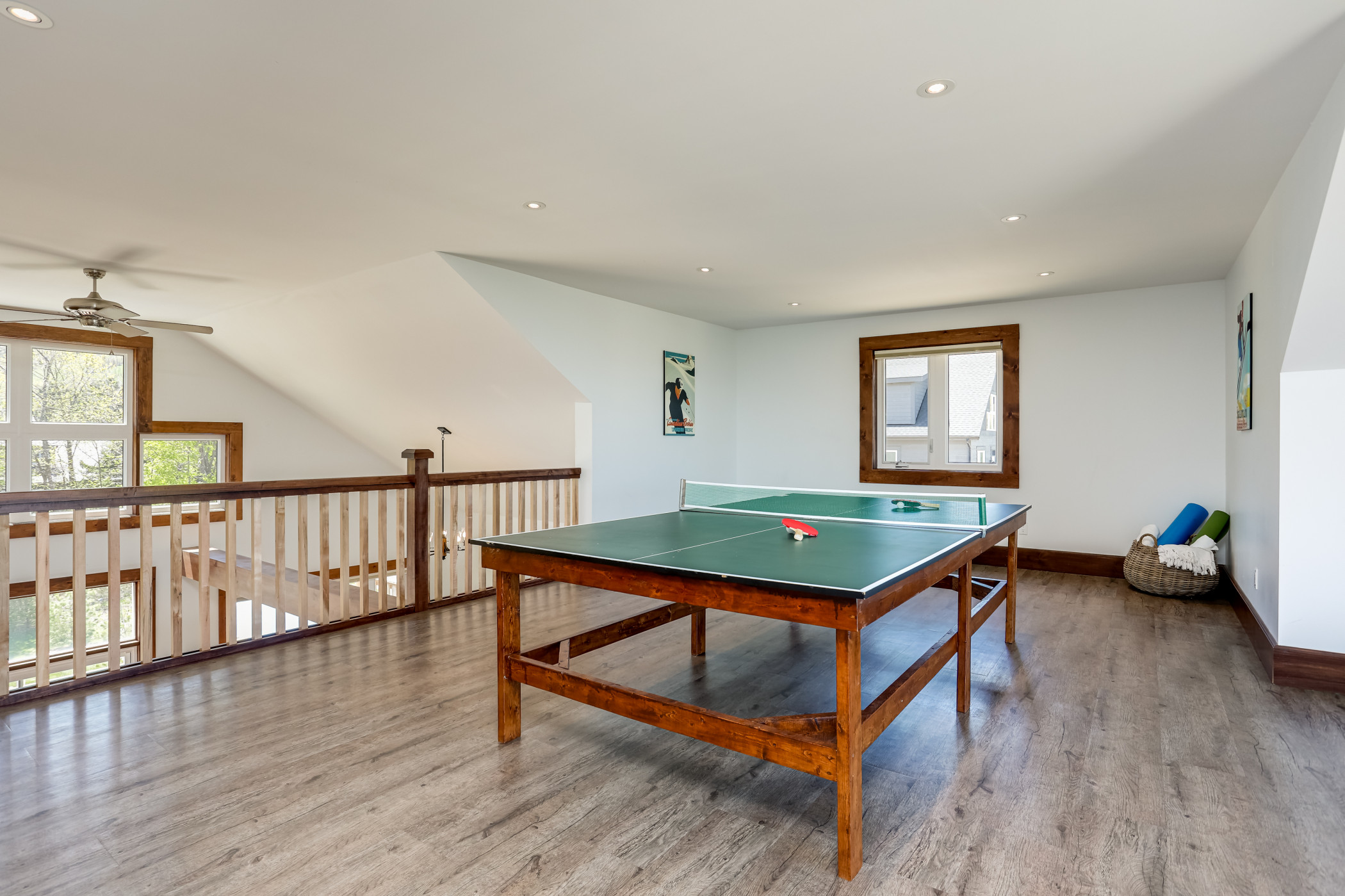 The main living room area has two spacious seating areas with one nestled around the fireplace and the other around the TV. The living room, dining area and kitchen are all under the same high vaulted ceiling which creates the perfect social atmosphere for great conversation with your company while cooking fantastic meals. On the upper level there is a large dedicated entertainment space with ping pong table and second sitting area with couches and a TV. This space would also be ideal for a yoga or fitness retreat providing ample room for mats and group exercise sessions.