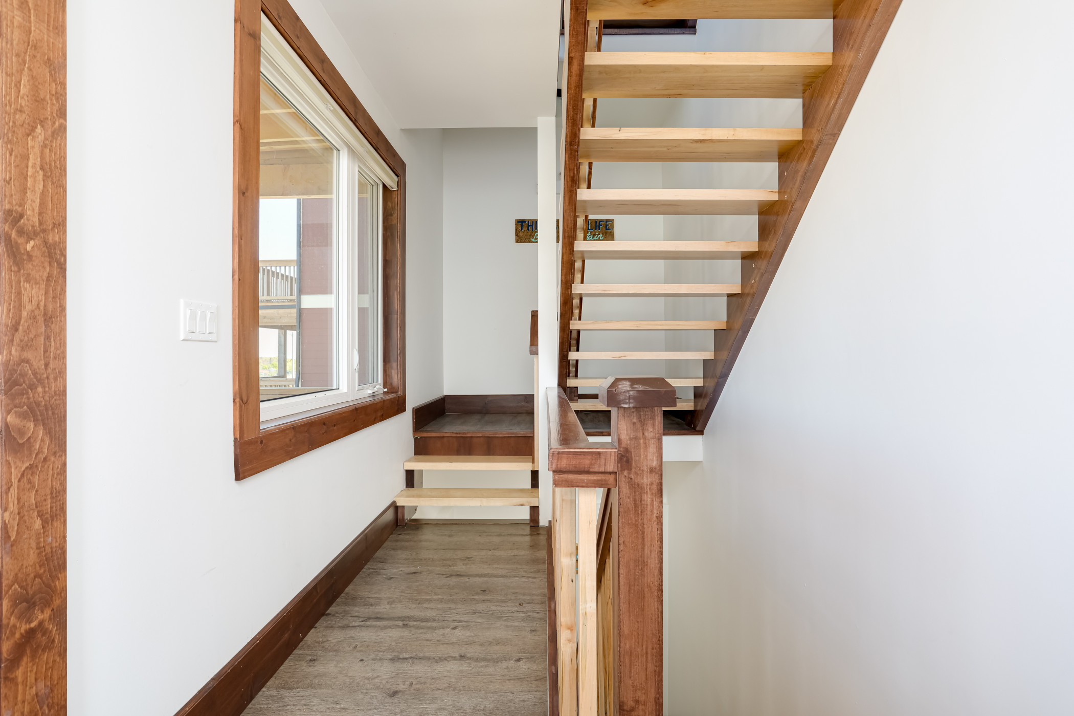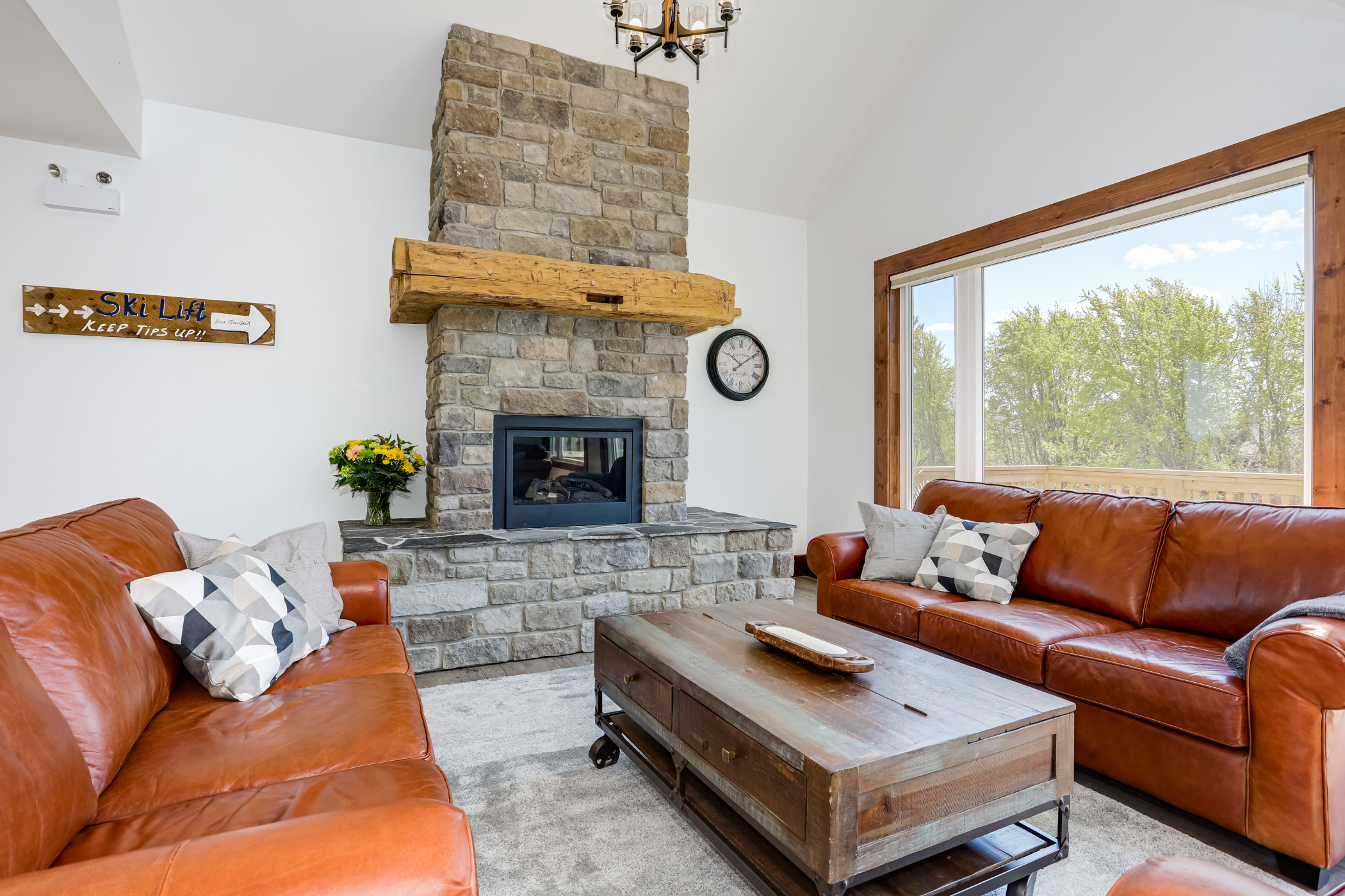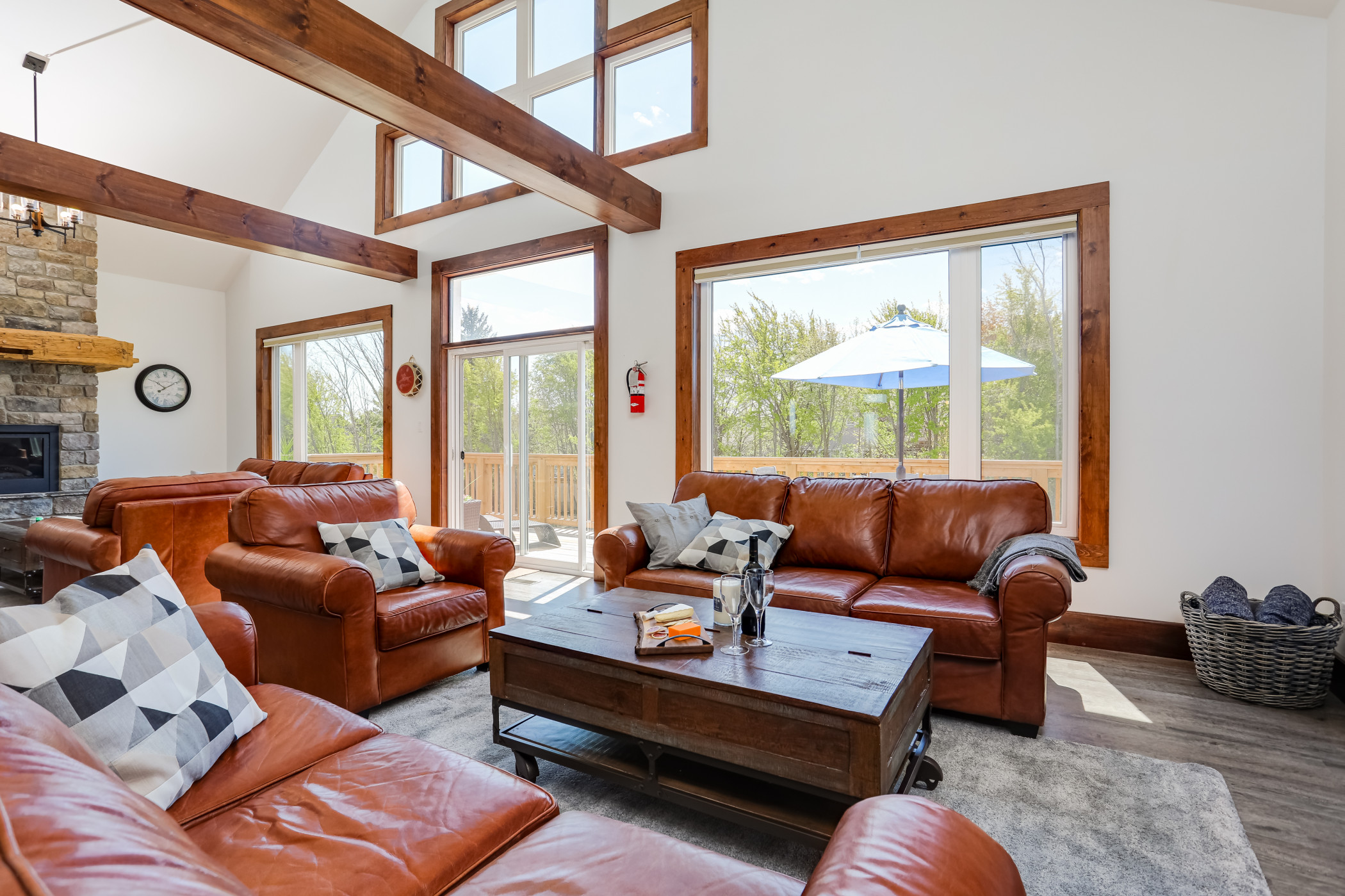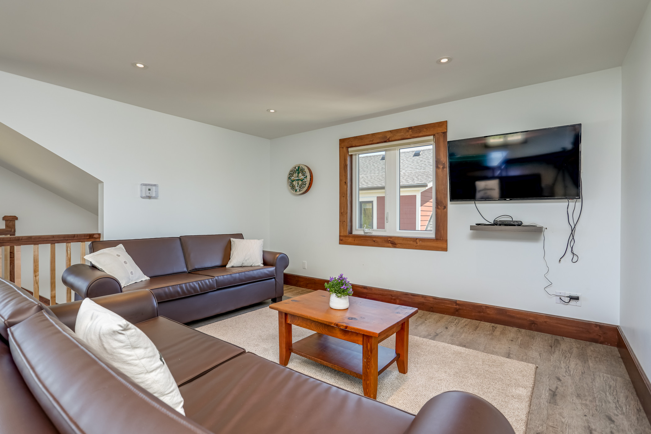 The main living room area has two spacious seating areas with one nestled around the fireplace and the other around the TV. The living room, dining area and kitchen are all under the same high vaulted ceiling which creates the perfect social atmosphere for great conversation with your company while cooking fantastic meals. On the upper level there is a large dedicated entertainment space with ping pong table and second sitting area with couches and a TV. This space would also be ideal for a yoga or fitness retreat providing ample room for mats and group exercise sessions.