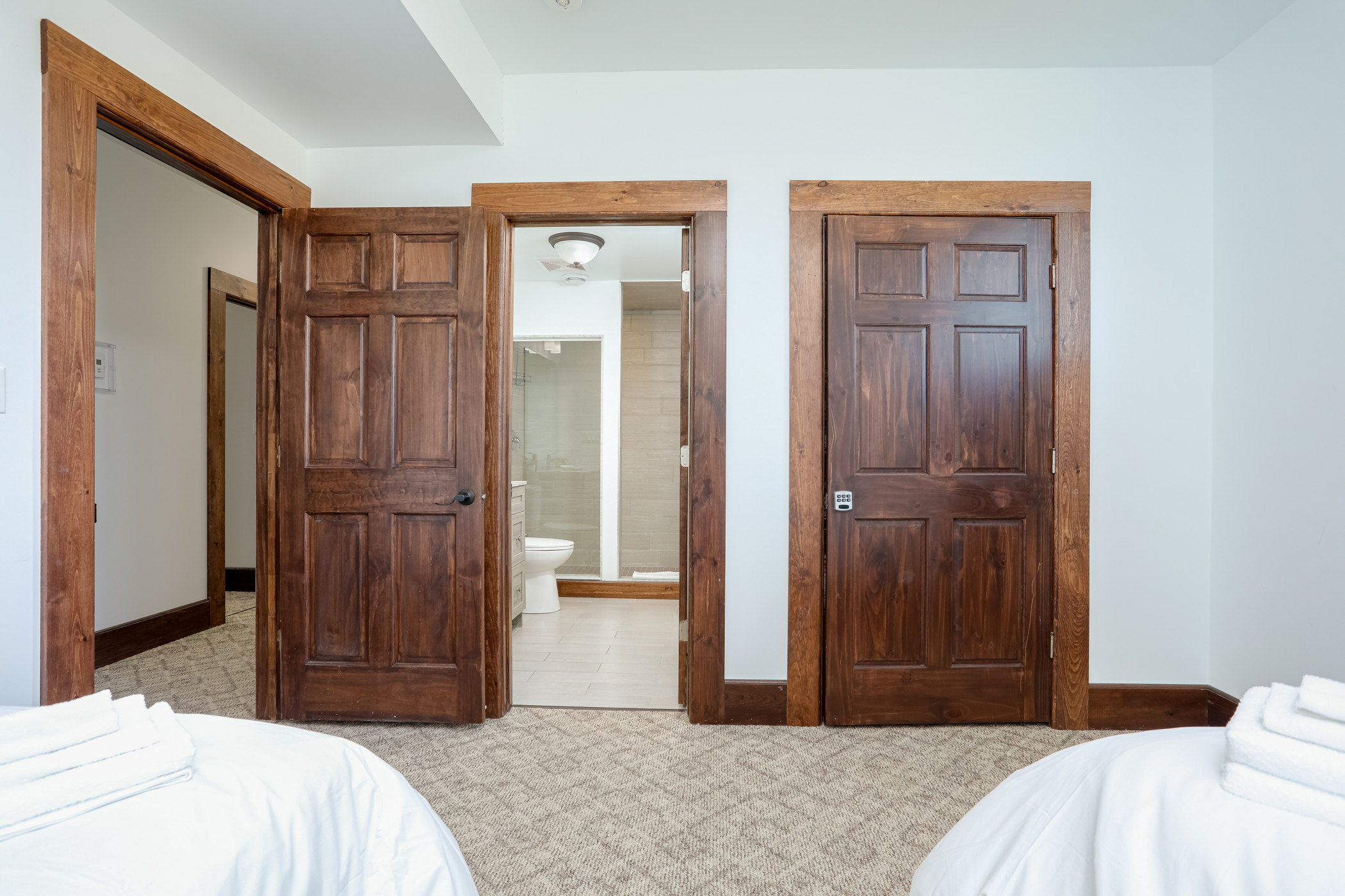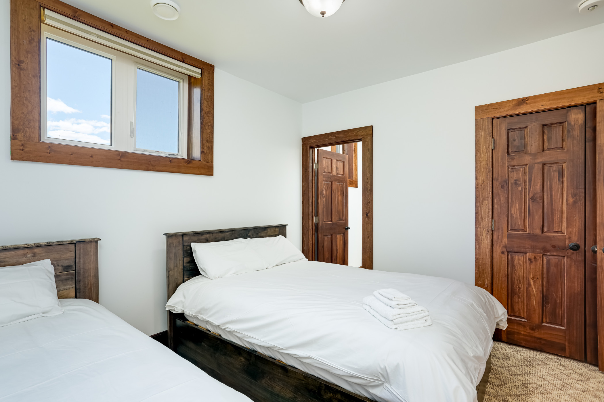 This chalet has a total of 8 bedrooms. 2 with King beds. 1 with 2 Double beds. 1 with 2 Single beds. 4 with 1 Single and 1 Double beds. All linens, pillows, and towels are included in your stay.