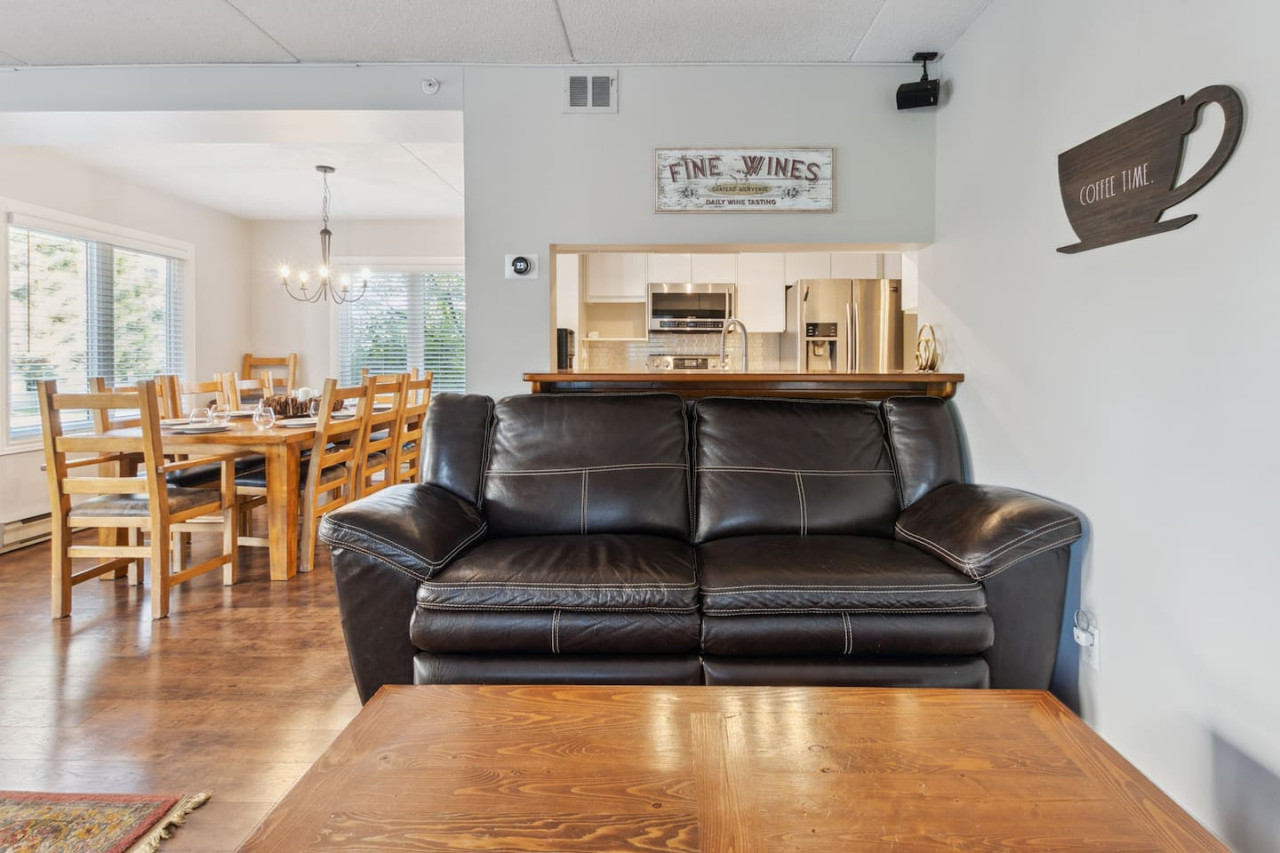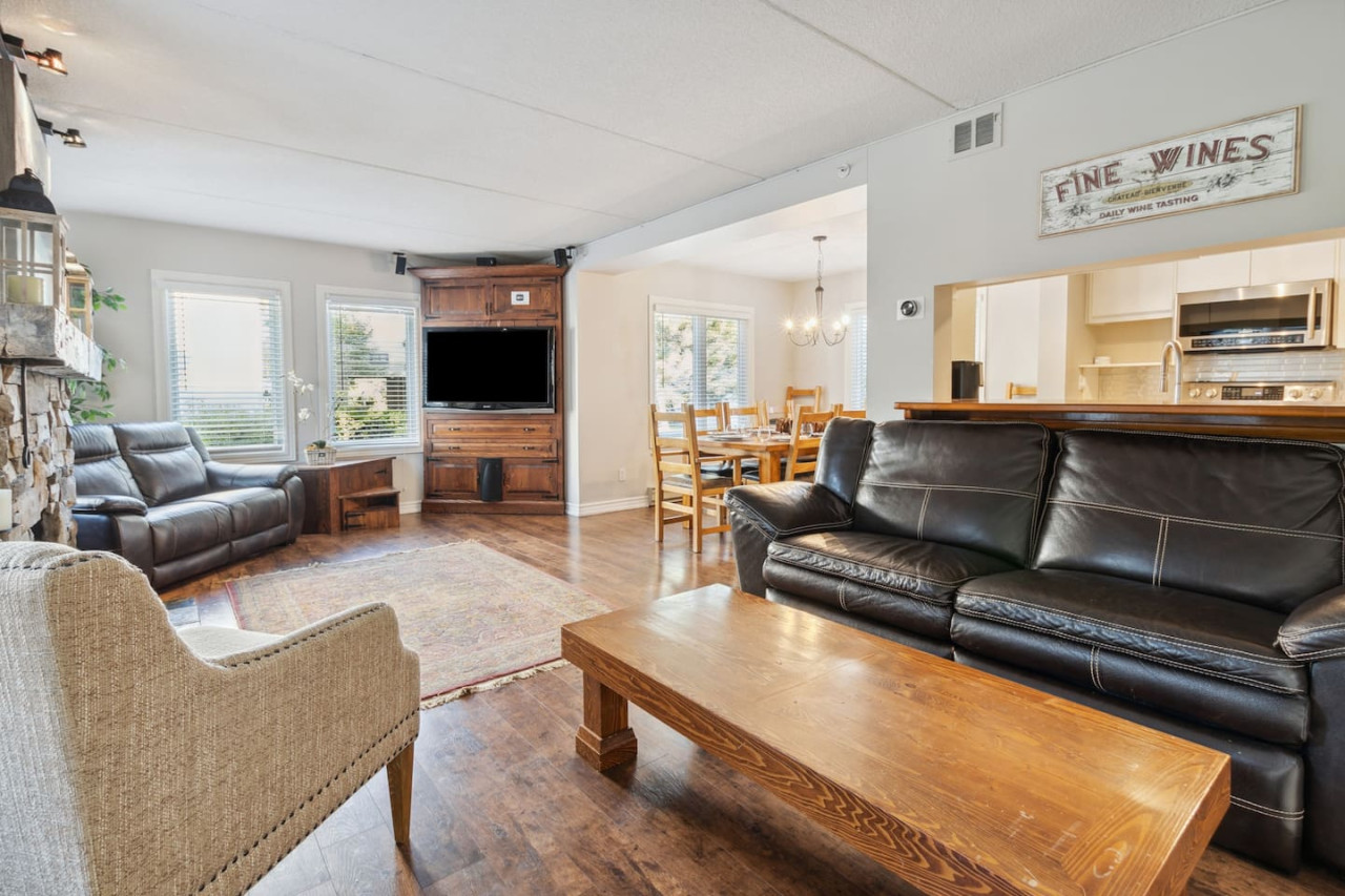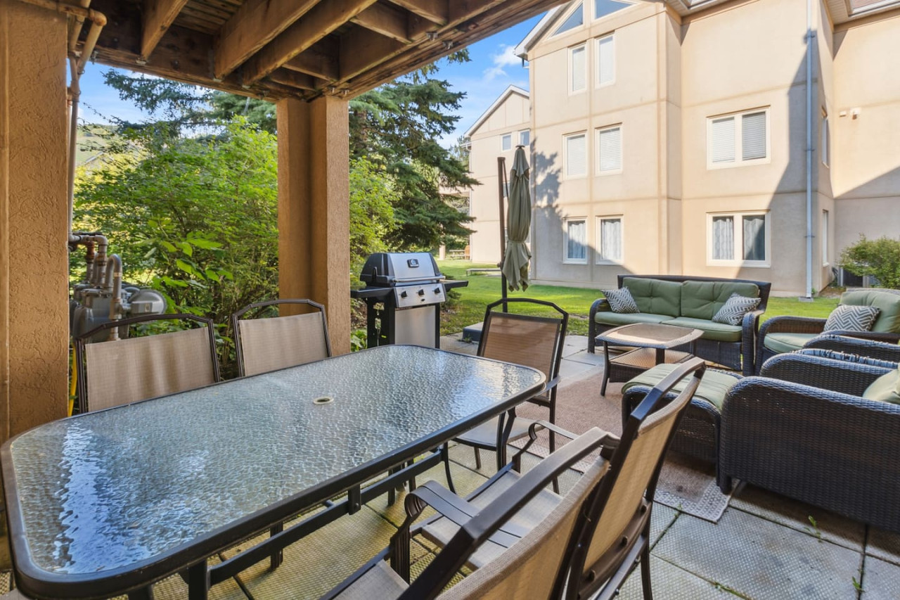 As you walk through the door, you’ll arrive in the spacious living area with a variety of comfortable seating facing the cozy gas fireplace and TV. The large windows provide bright natural light and views of the mountain. Sliding glass doors provide easy access to the private patio, complete with a BBQ and outdoor furniture for warmer days.