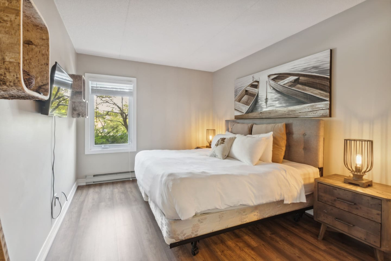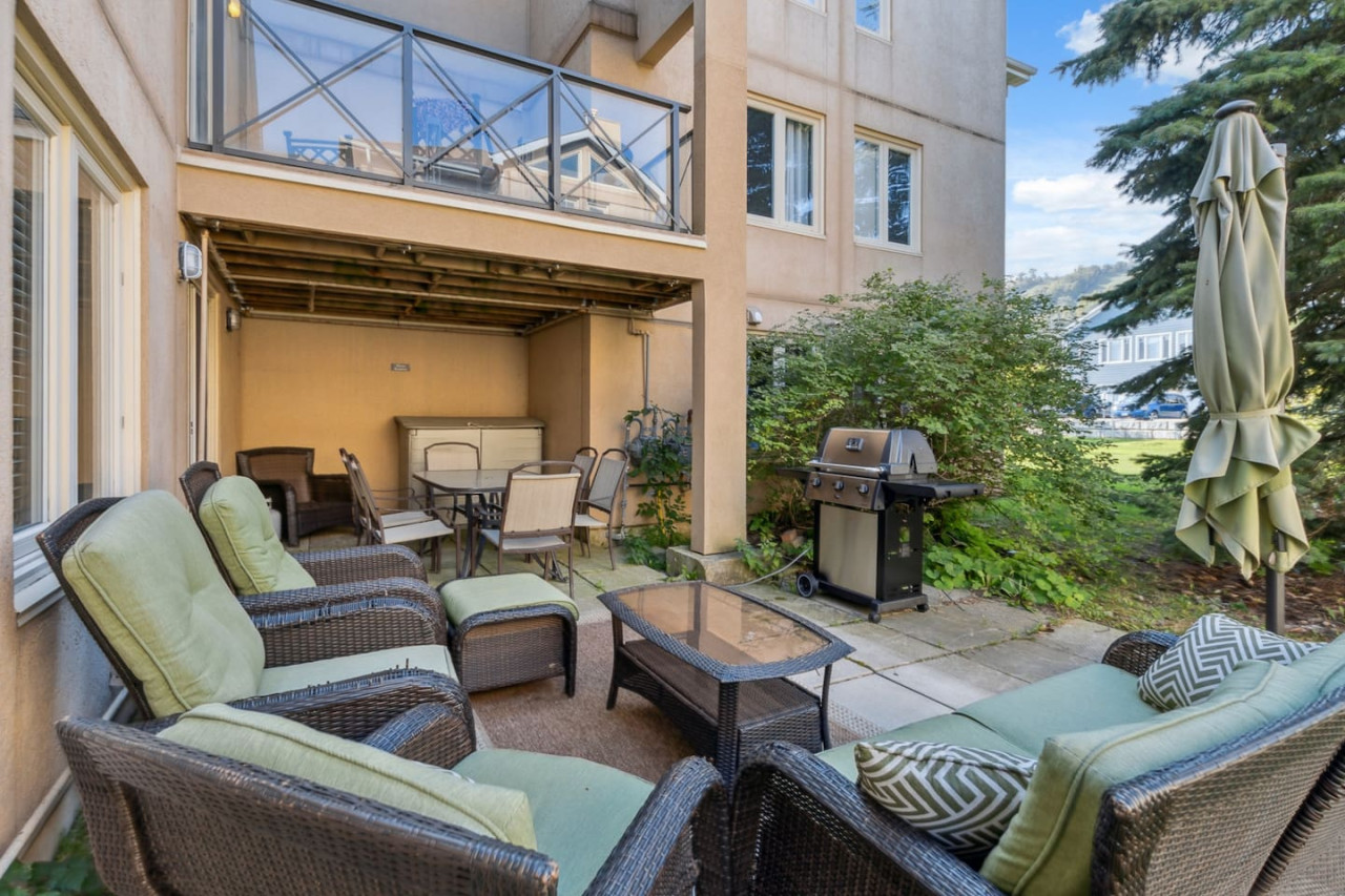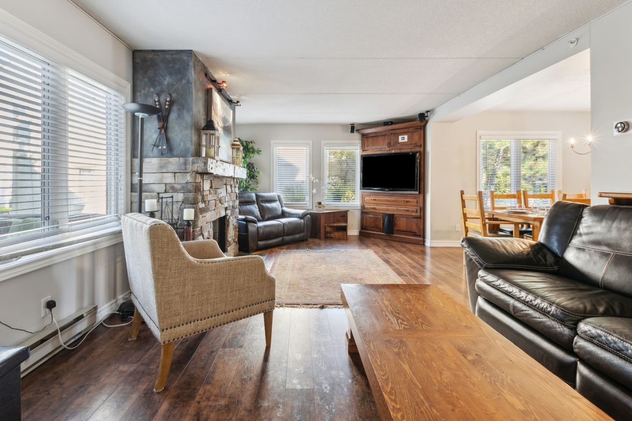 As you walk through the door, you’ll arrive in the spacious living area with a variety of comfortable seating facing the cozy gas fireplace and TV. The large windows provide bright natural light and views of the mountain. Sliding glass doors provide easy access to the private patio, complete with a BBQ and outdoor furniture for warmer days.