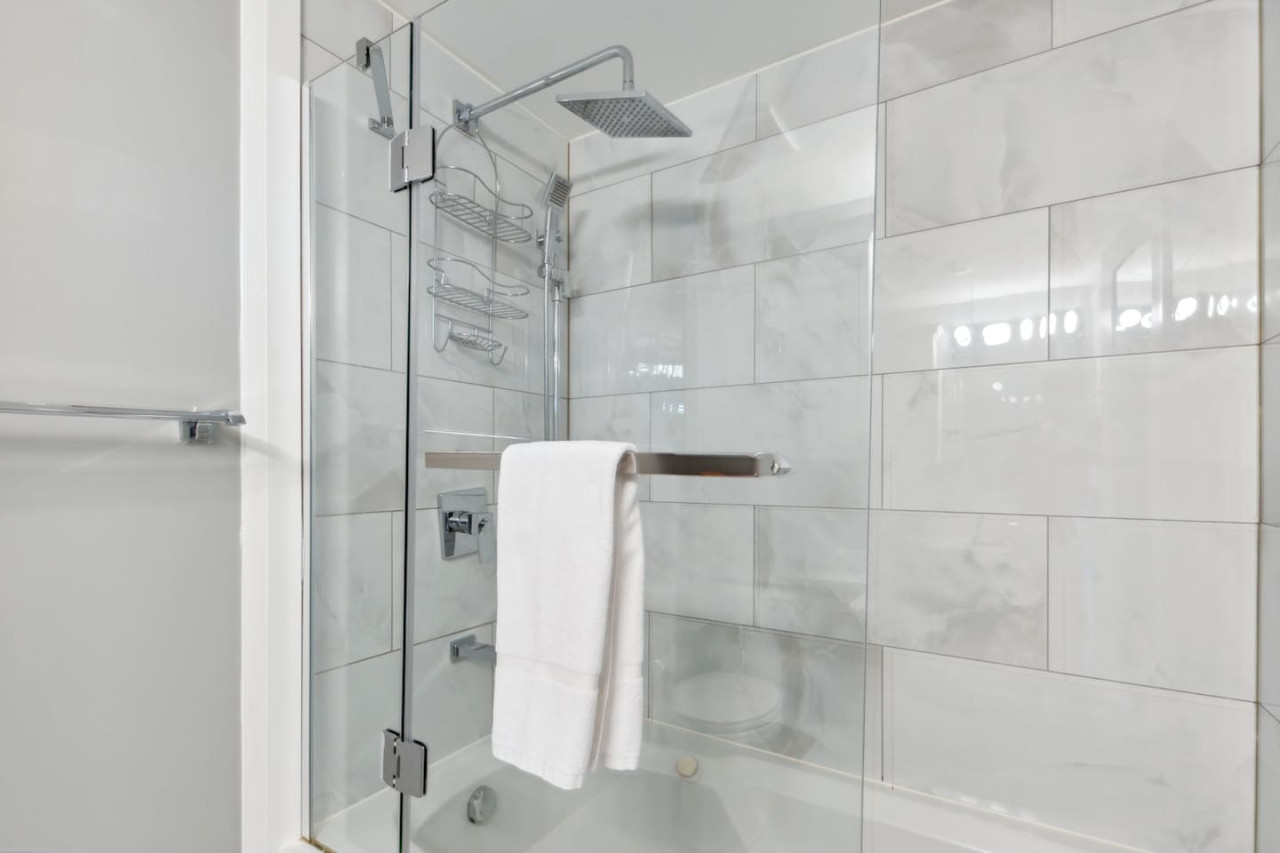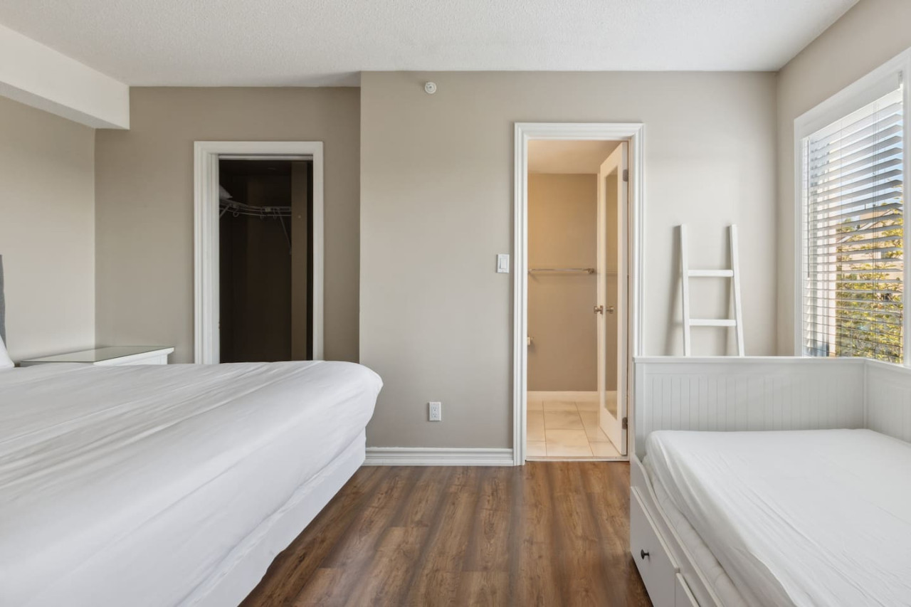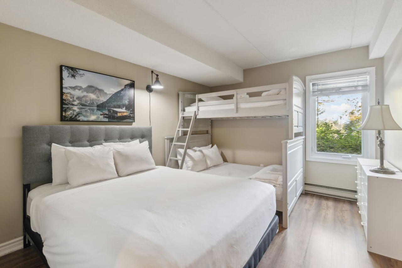 There are 2 bedrooms on the main floor of this home. Bedroom #1 features a King size bed, and bedroom #2 has a Queen size bed as well as a single over double bunk bed. The main floor also includes a full bathroom with a shower. On the second floor, you’ll find bedroom #3 with a King size bed, and a Single bed with an additional single trundle bed. Bedroom 3 also has a full ensuite bathroom with a shower-in-tub.