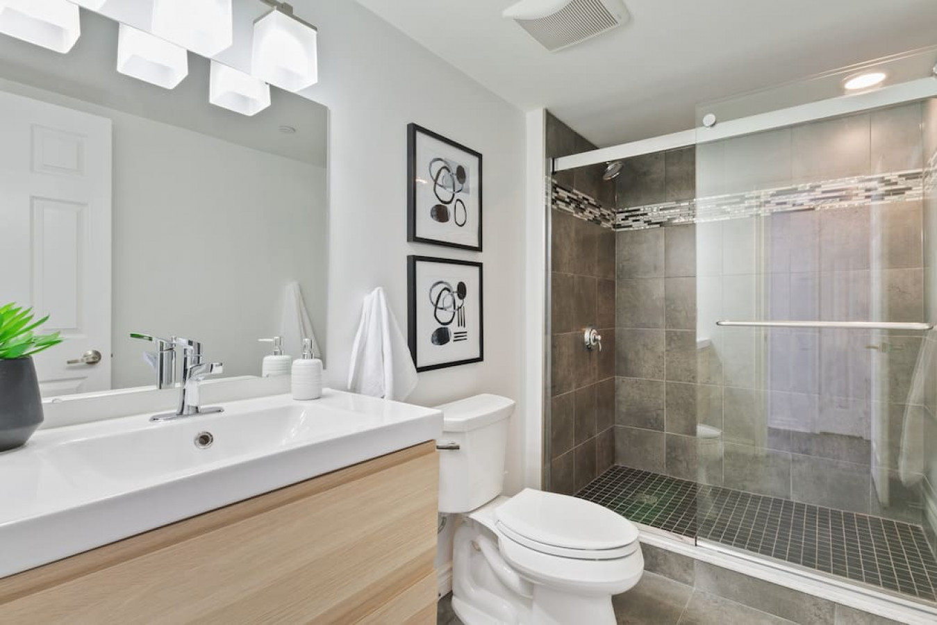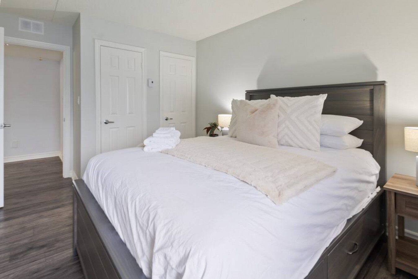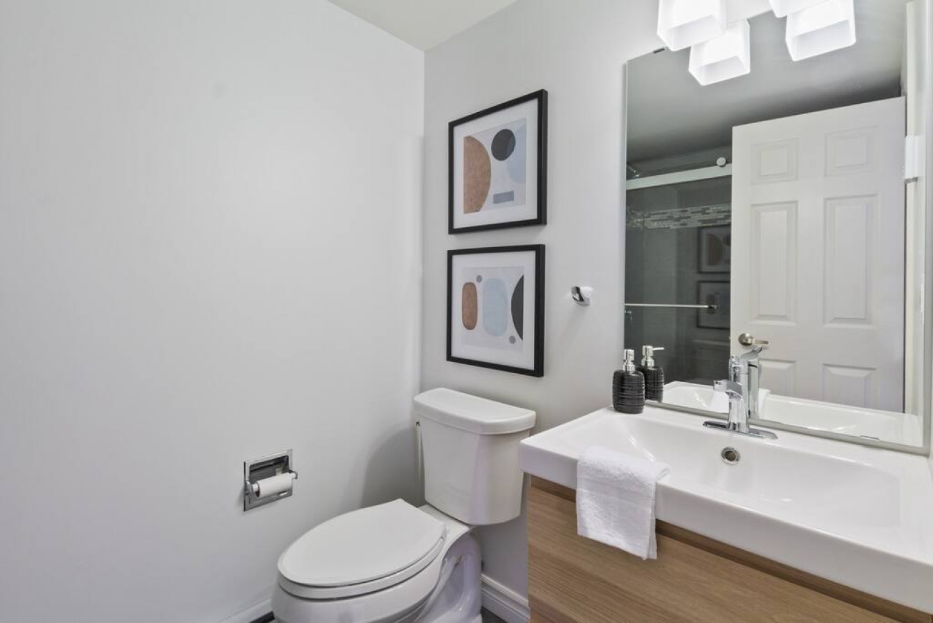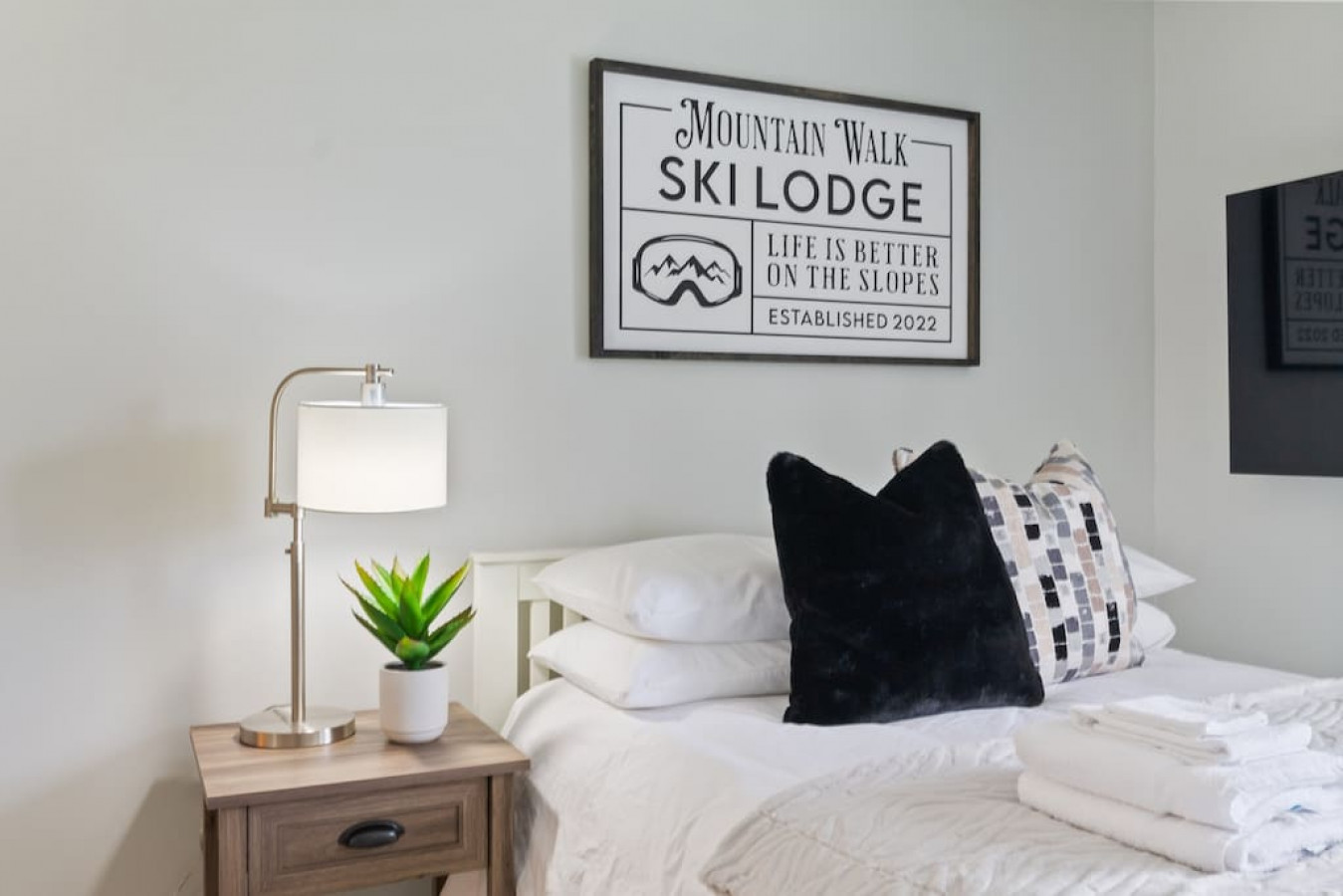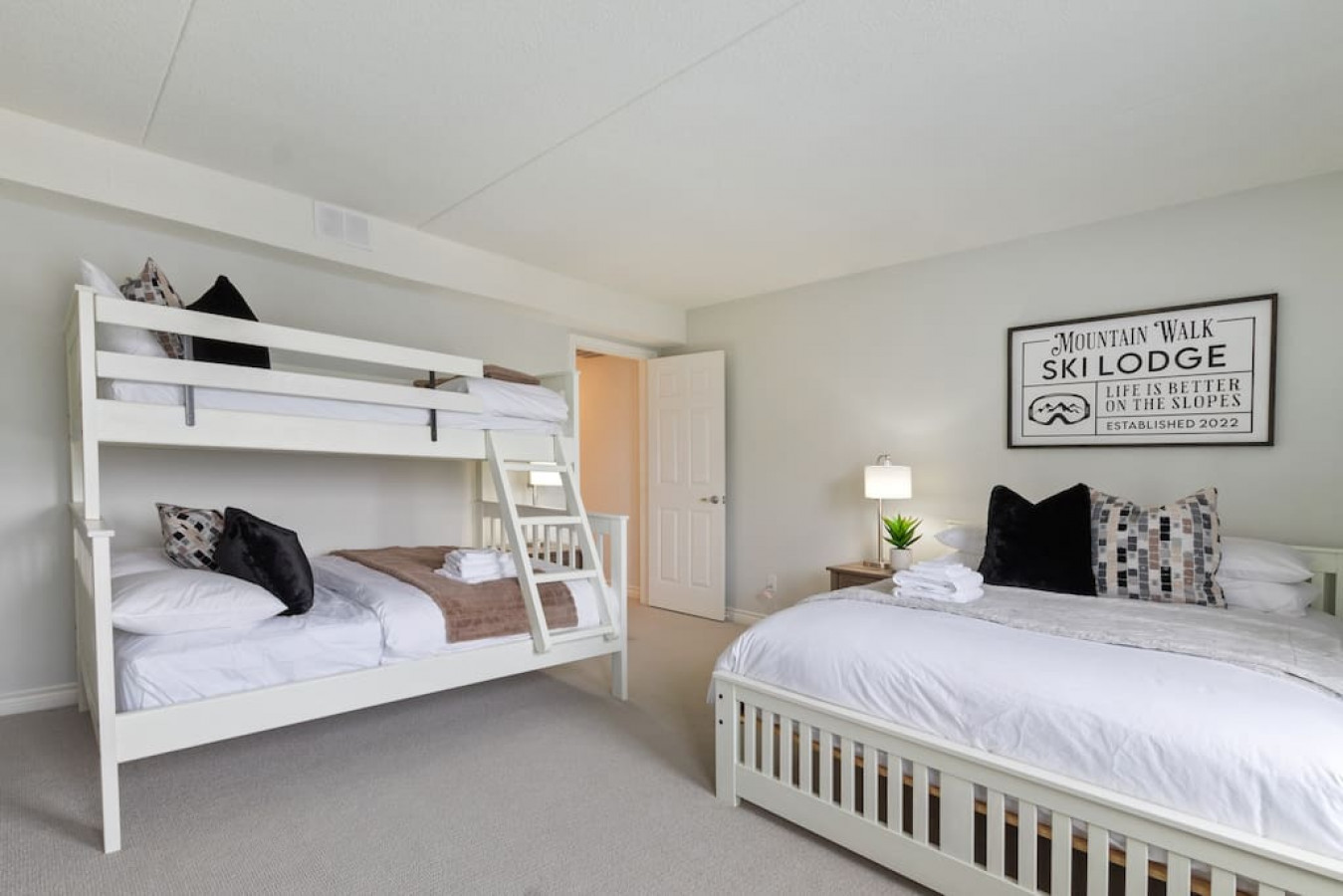 You’ll find two generously sized bedrooms that feature soft, comfortable Queen beds and elegant bedding on the main floor. In the first bedroom, you can take advantage of the peaceful desk setup to sneak in a few hours of work if need be. Upstairs, you’ll find an oversized bedroom with 3 piece ensuite that hosts a King bed and Single over Double bunk bed. Wake up and walk right to the mountains from this contemporary chalet that’s minutes to everyone's favourite Blue Mountain activities.