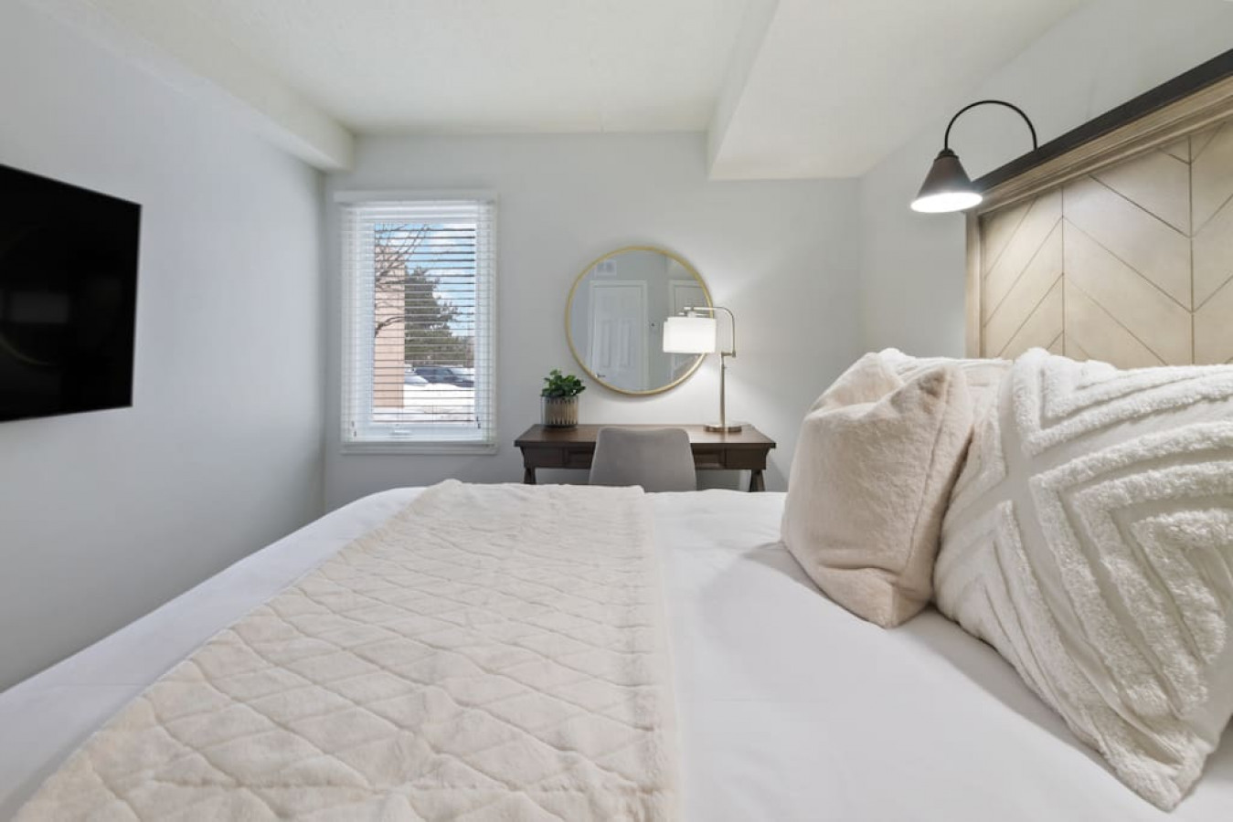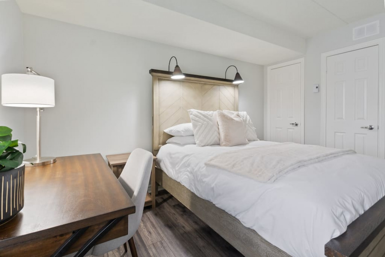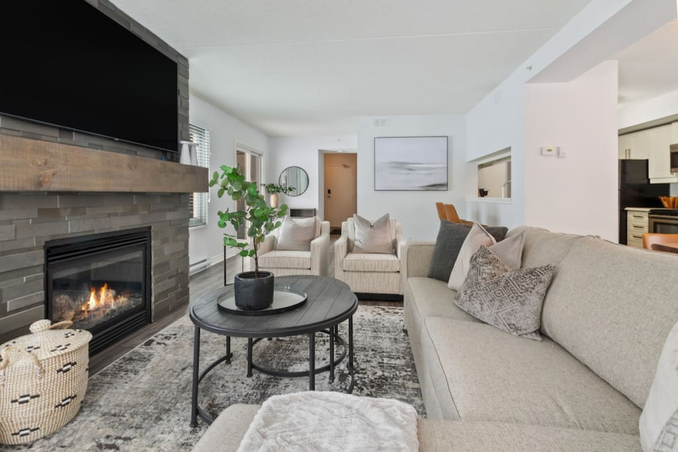 Get mesmerized easily by watching the skiers coast down the mountain right from your living room. Retreat back after a long day of adventure to your comfortable Great Room that features a large flat-screen TV and a beautiful stone fireplace to cozy up to. Whether you’re curling up with a book, having a movie night-in, or catching up after a day of exploration, there is plenty of comfortable seating throughout. You can count on connectivity with in-suite Wi-Fi. Timeless, classic furnishings provide a luxury feel during your stay.