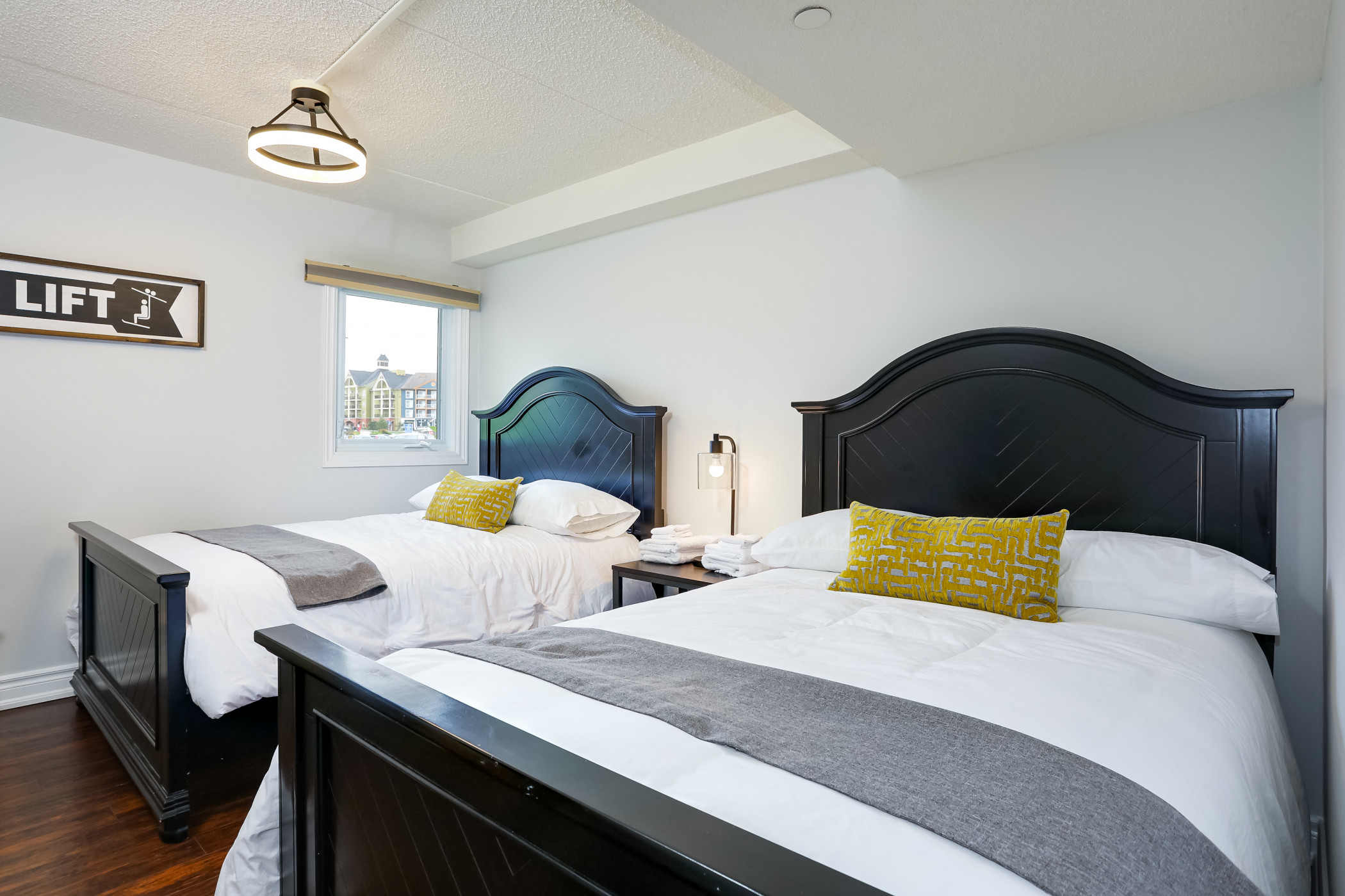 The Master Bedroom Features a king size bed. The second and third bedroom each have two separate beds. Enjoy the tastefully decorated condo/chalet in an ideal and quiet location Brand new comfortable beds with fresh sheets provided. Fresh towels, shampoo, conditioner, and soap is also provided in both bathrooms. Fully equipped kitchen, wifi and cable.