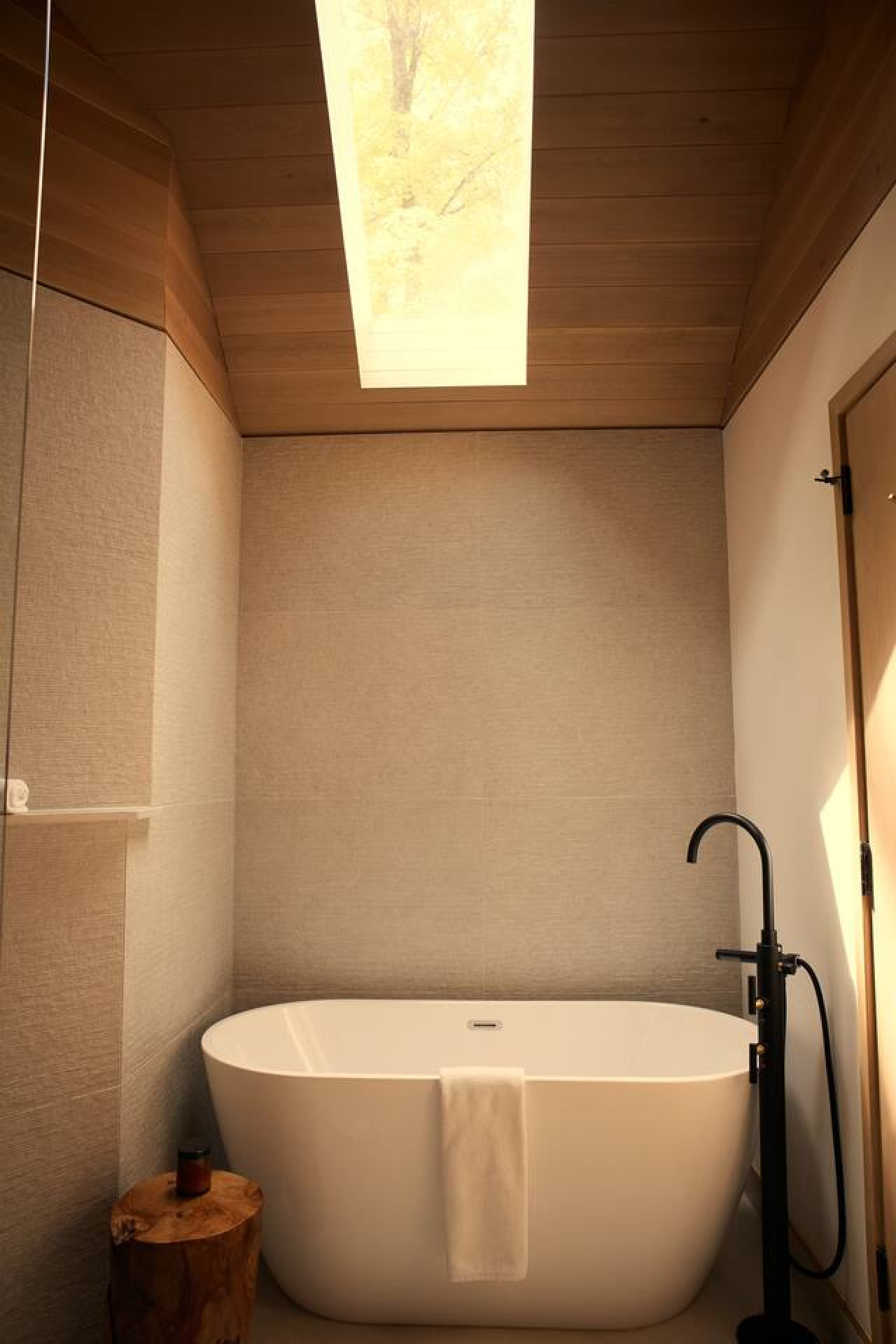Each cabin suite is approximately 450 square feet and equipped with one organic queen bed, a walk-in shower, and a deep soaker tub. Interiors are modern and light-filled, featuring a private deck and window seat to quiet your mind and immerse you in nature. Cabins do not include a kitchenette - instead, enjoy chef-prepared meals serviced daily as part of your full-board retreat.