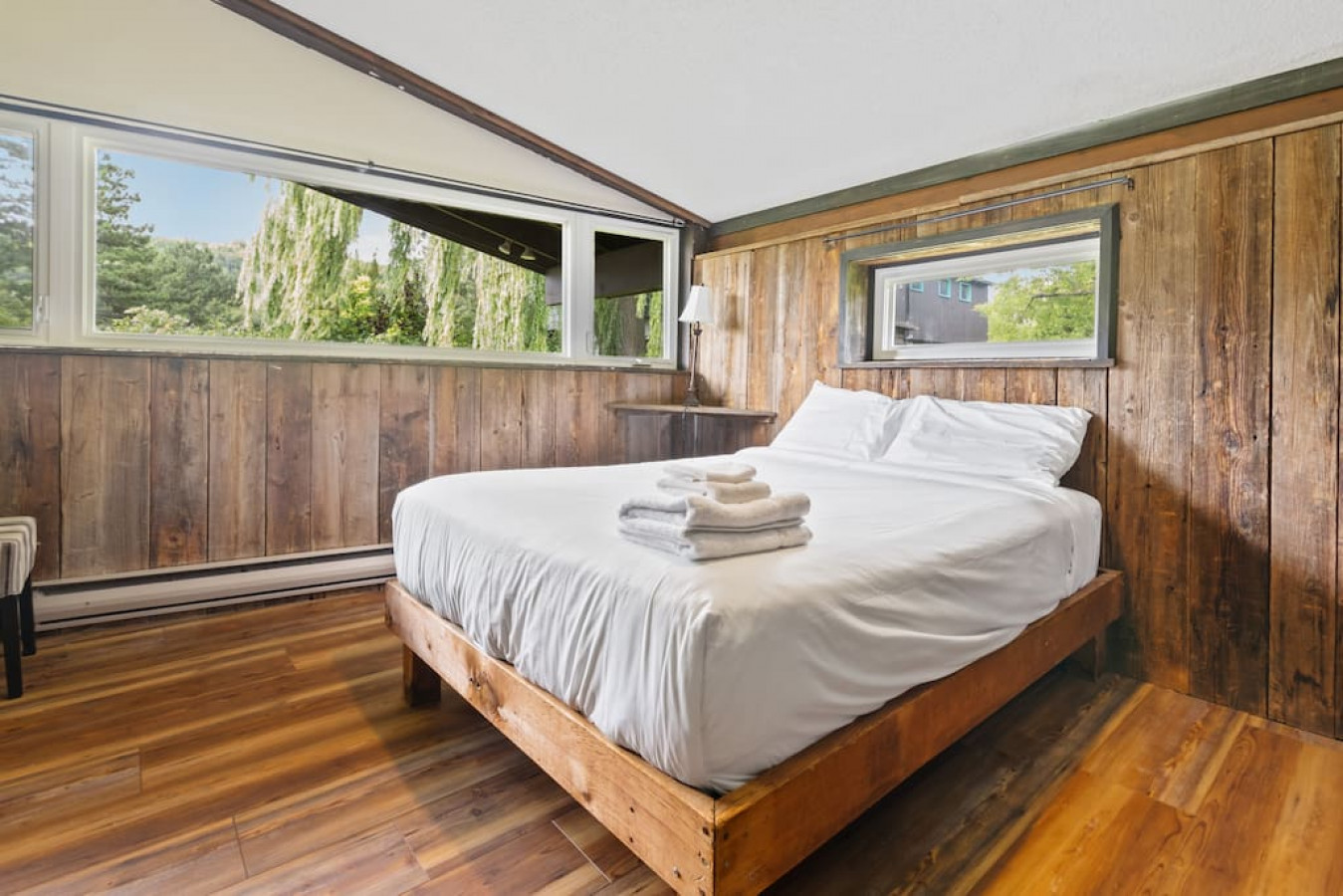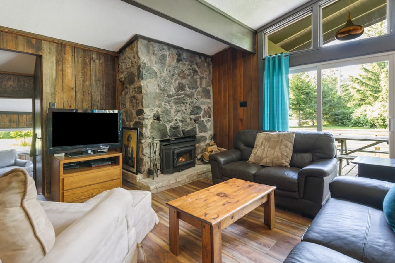 Relax and unwind in the cozy living room, where you'll find plush seating arrangements centred around a charming fireplace. Bask in the warm glow as you recount the day's adventures or indulge in a movie night with your loved ones. The living room is adorned with large windows, inviting you to take a moment to enjoy the surrounding nature. **Please note this home does not have air conditioning. There is central heating for colder months.
